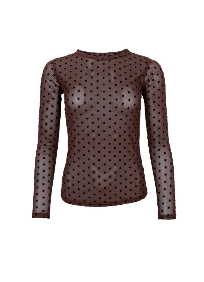 Jennie mesh blouse is a comfortable long-sleeved polka dot blouse that is ideal for layering.  Wear it under your dress or blouse to add extra dimension to your look.