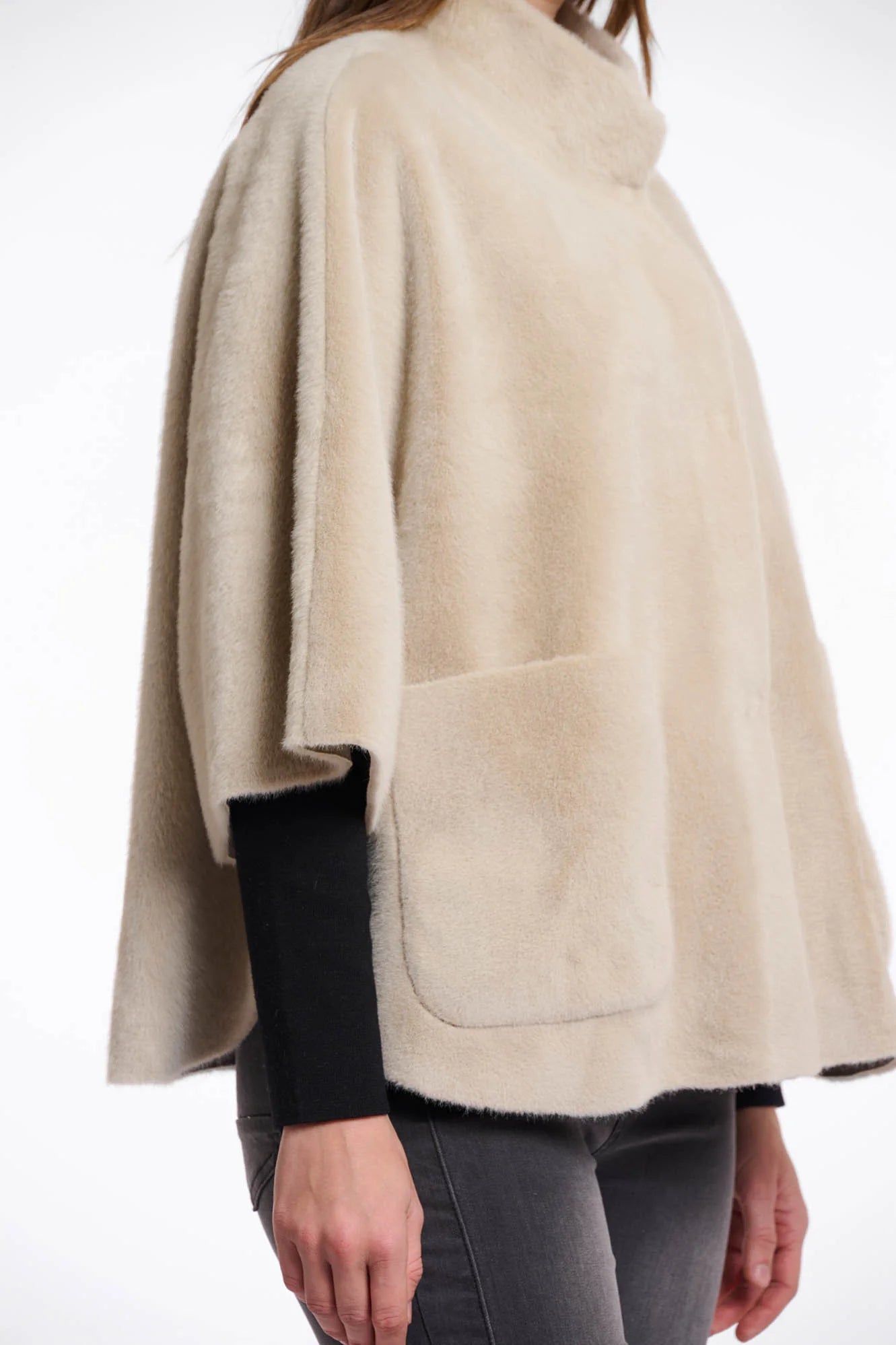 Wrap yourself in pure luxury with this stunning faux-fur cape. The plush material boasts a softness that will make you feel like royalty. This cape features two open front pockets, a snap button closure on the front, short sleeves and slit details at both sides.