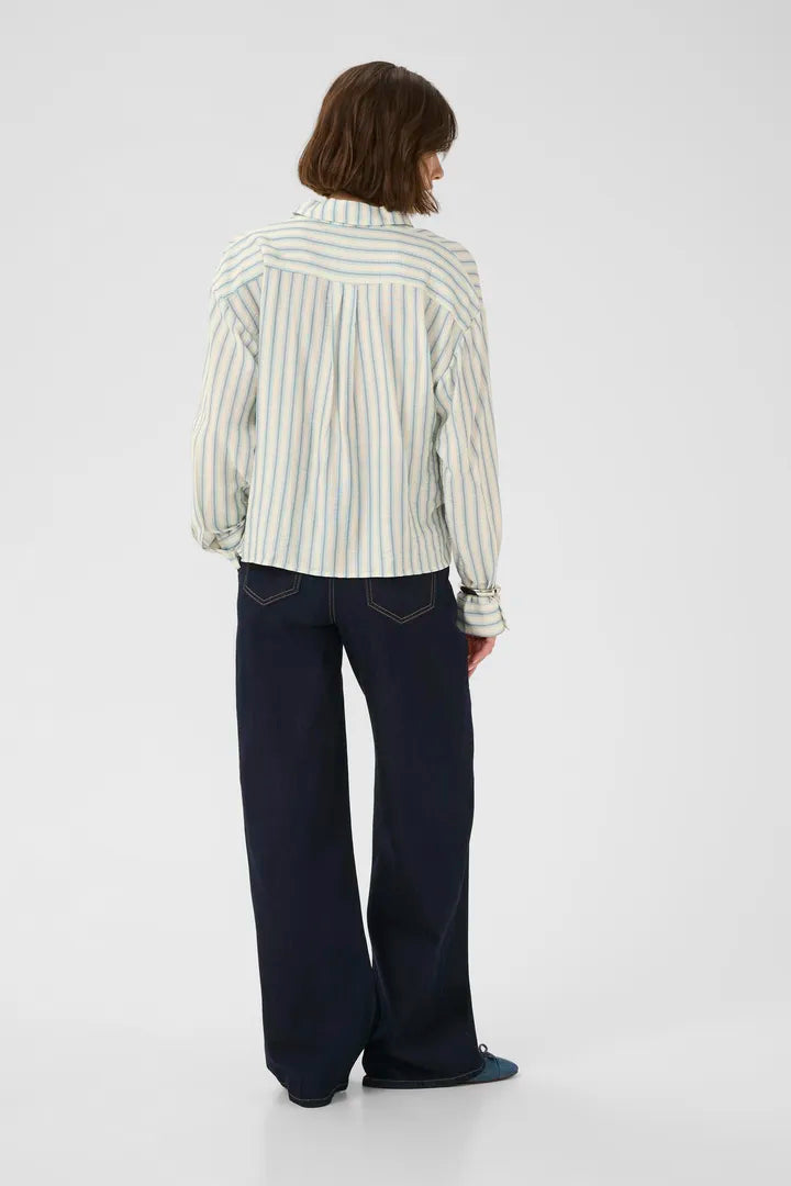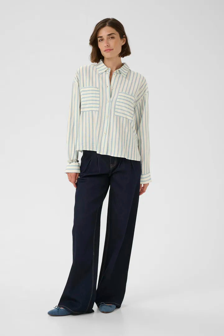 Striped shirt with a boxy fit, classic collar, button front, two large chest pockets, and long sleeves with button cuffs. Features a crisp, structured look.