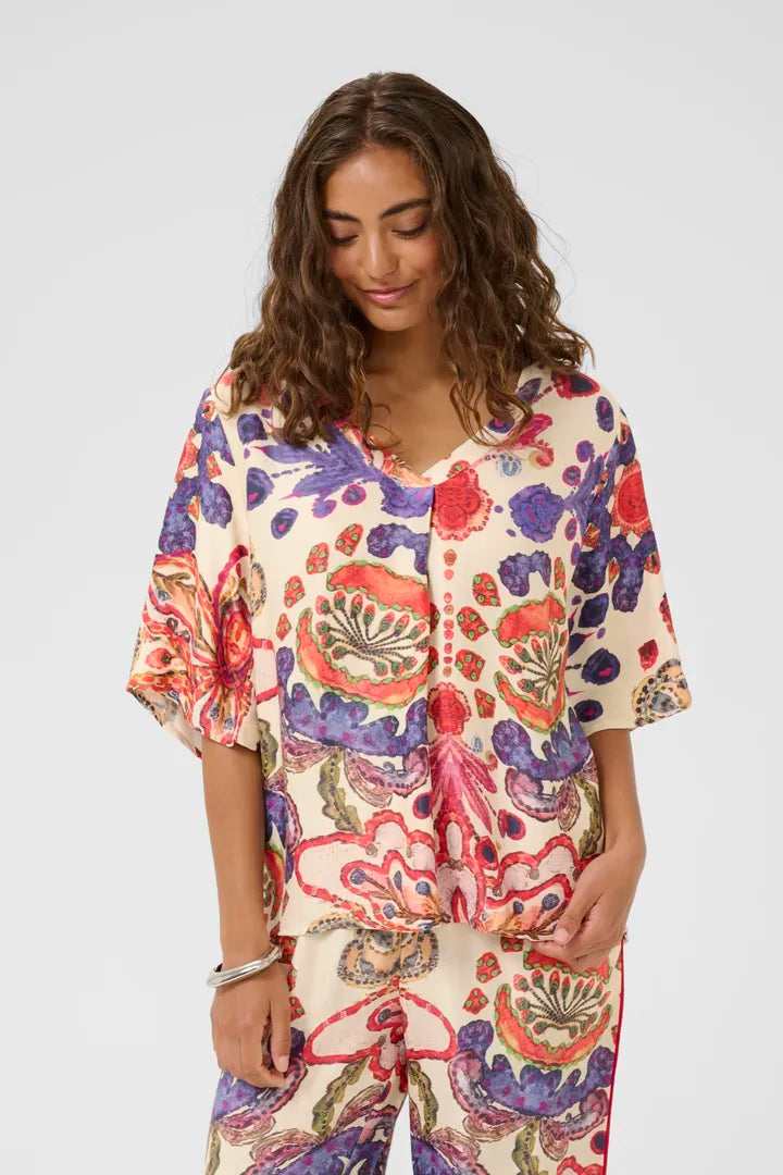 This relaxed fit women's blouse delivers modern style with a v neckline, short sleeves and a fun all over print, pair with the CUMandy Trousers and a white trainer for the perfect spring outfit.