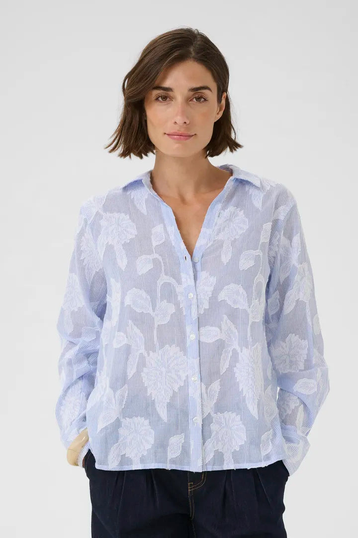 Button-up shirt with a straight, loose fit and classic collar. Features long sleeves and a slightly sheer, lightweight appearance with a rounded hem.