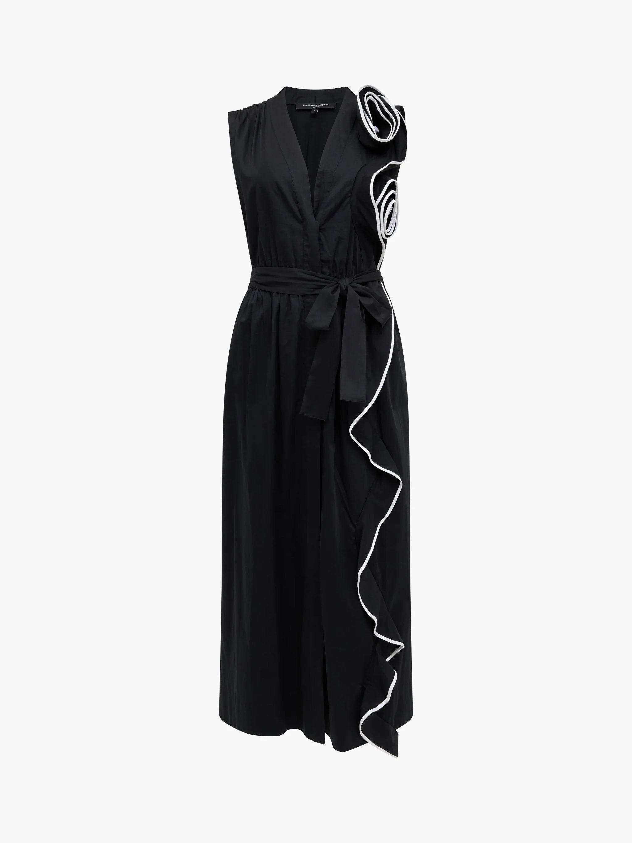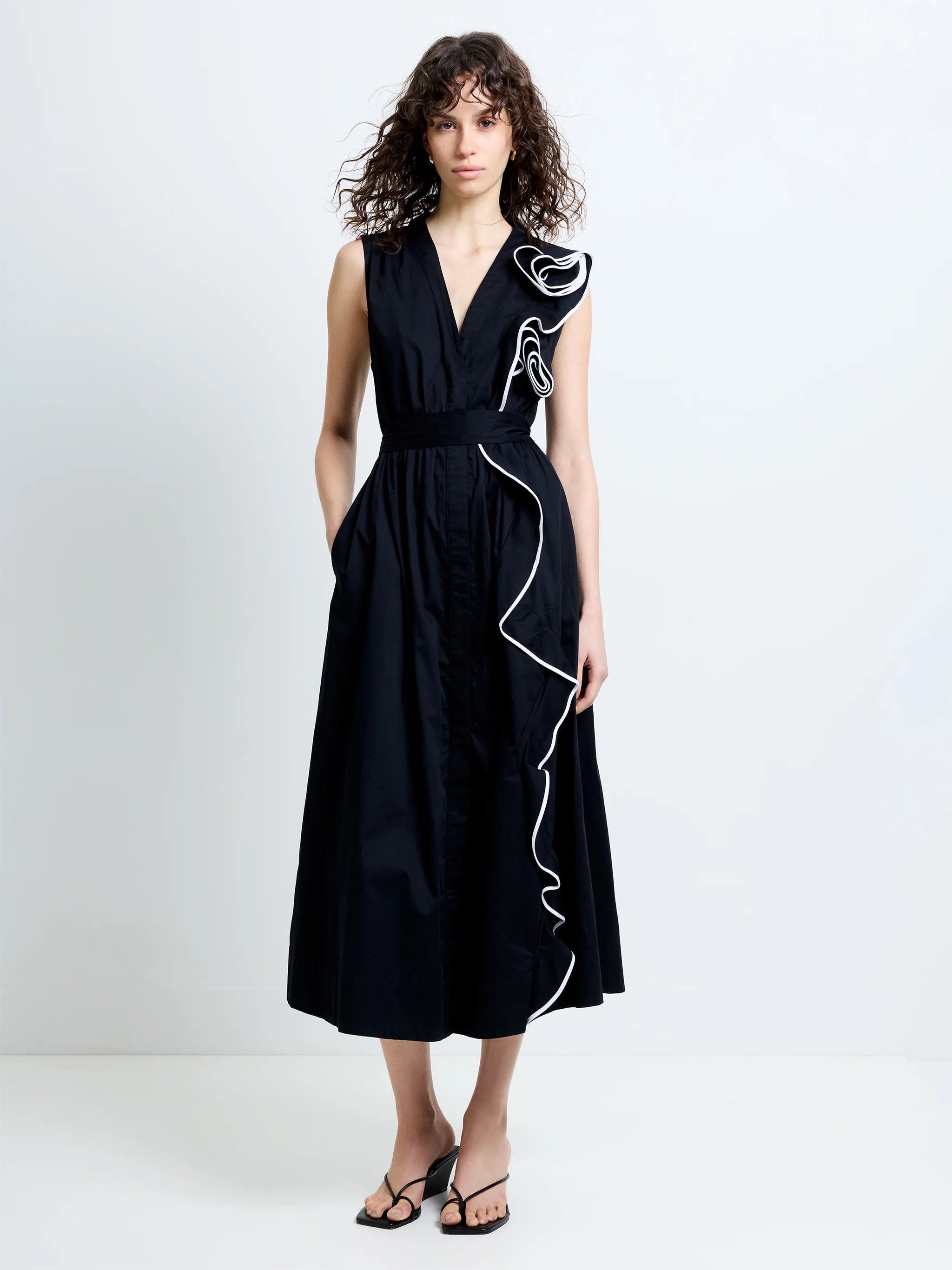 There's drama in every detail of this monochrome midi. Our Alexis Poplin Corsage Dress features a v-neckline, elasticated and belted waist, invisible pockets and a contrast tipped ruffle corsage detail.