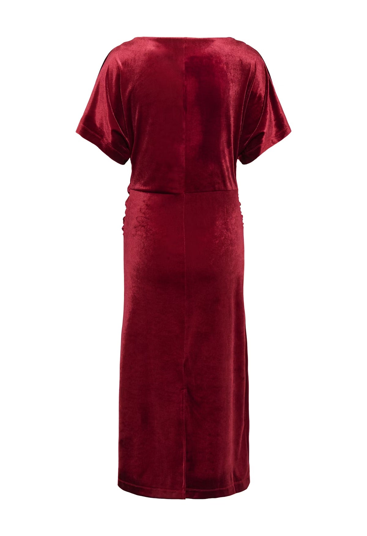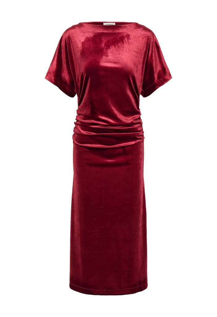 Dress in deep red velour with side draping and loose short sleeves. The soft fabric and clean, elongated silhouette create an elegant and comfortable look. Model is wearing size M.