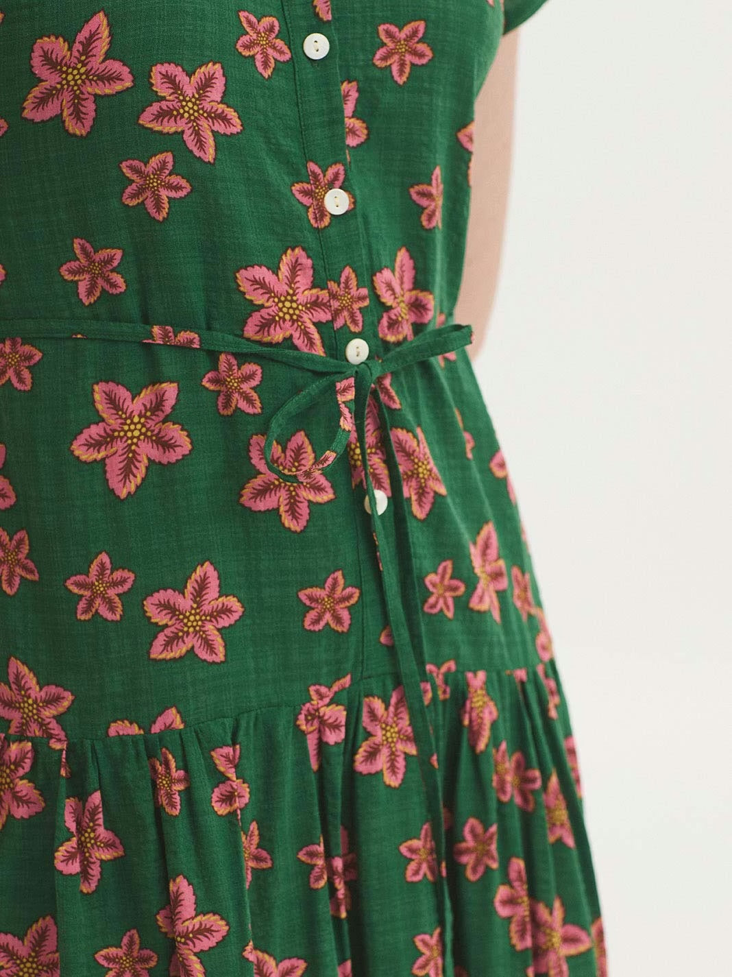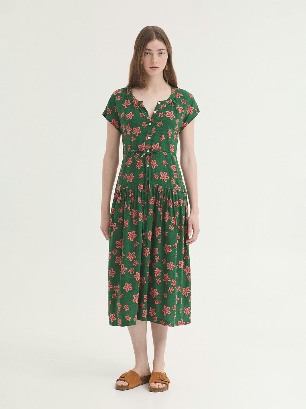 Star flowers printed dress, round neckline, short sleeves, button closure, tie waist, a line shape.