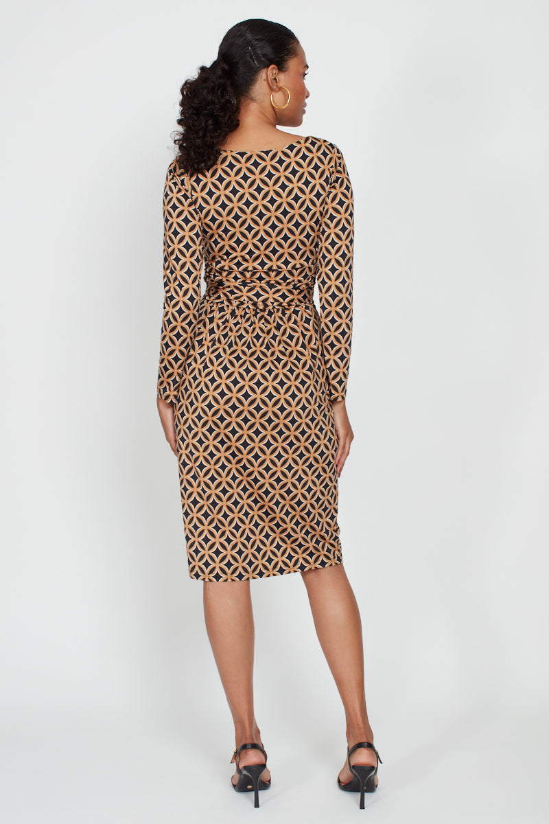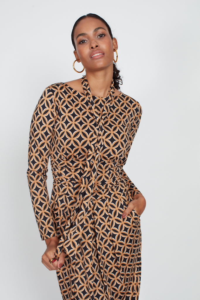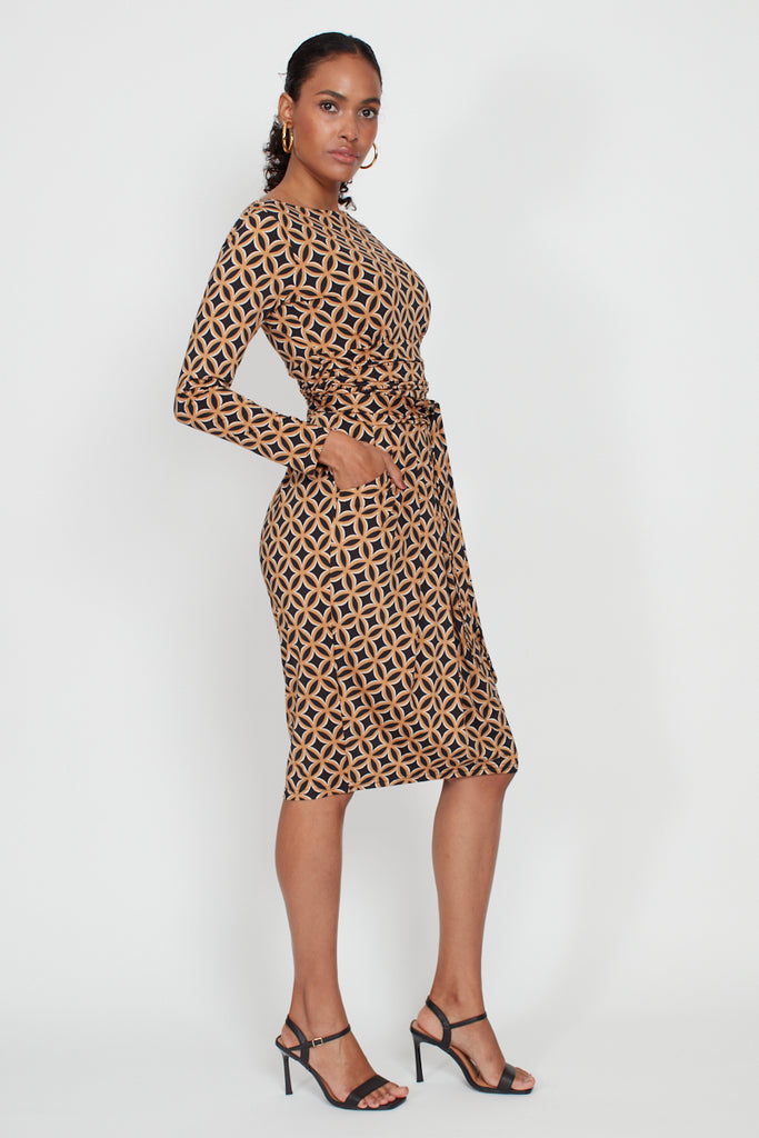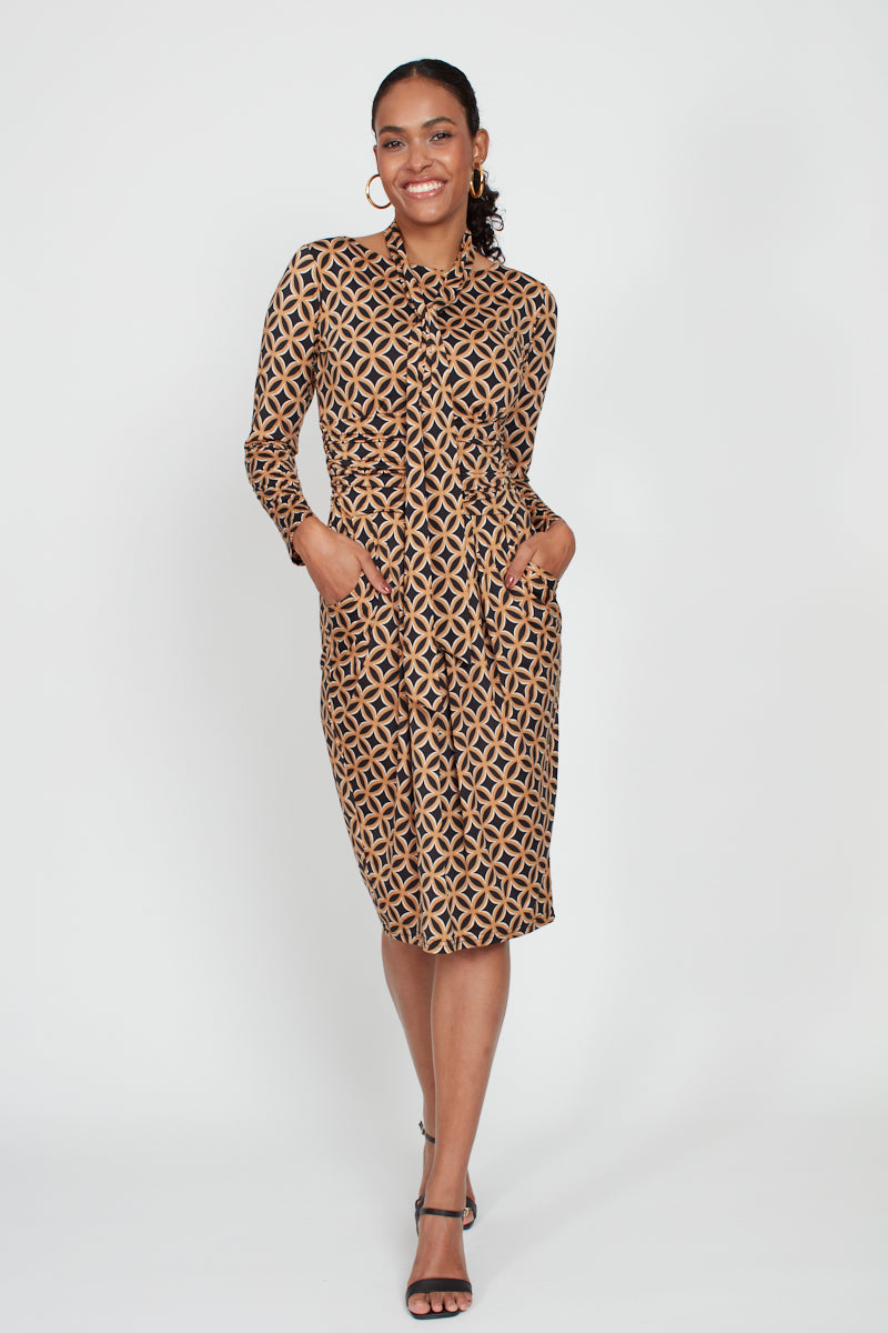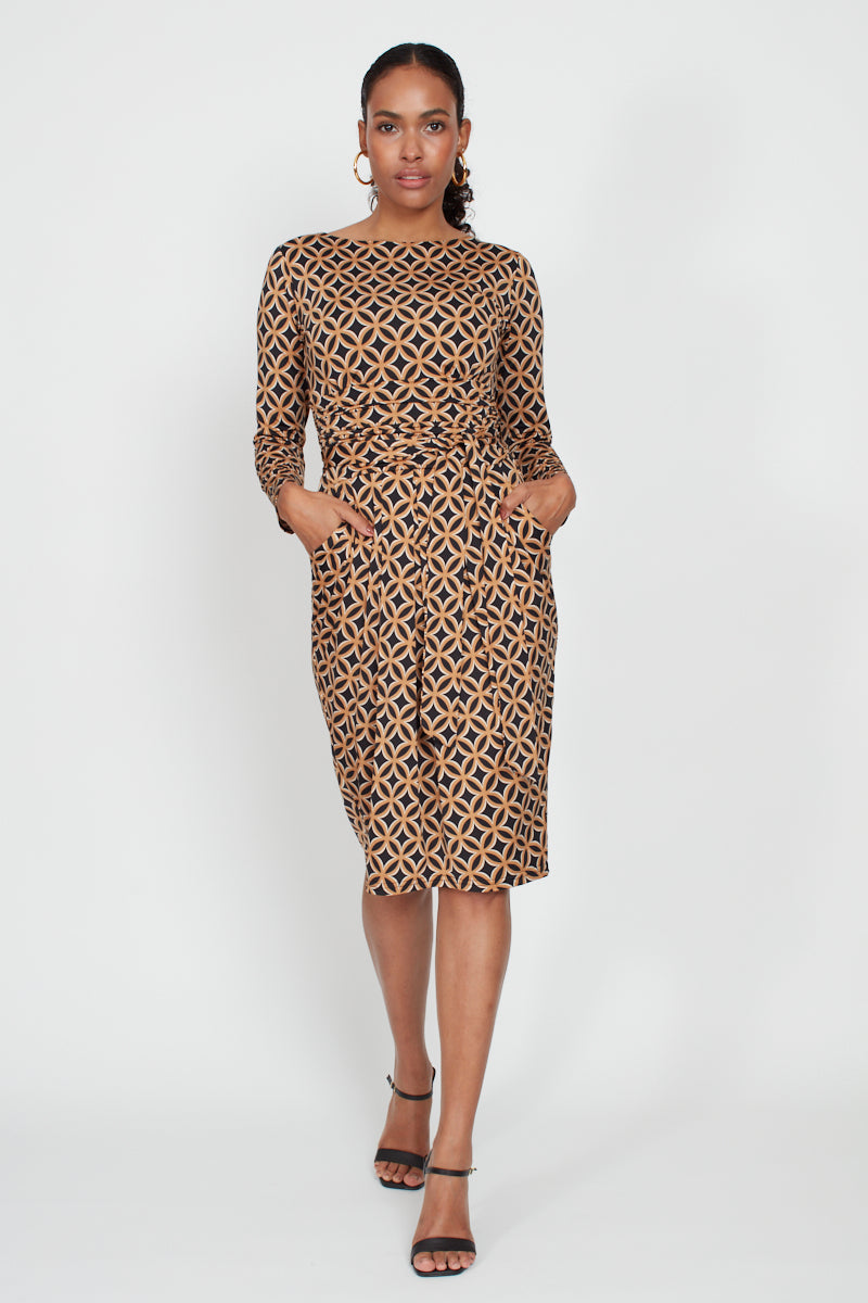 Our Onjenu Sydney has a round neckline with long length sleeves and pockets on either side. The ruched band pulls in from the waist and back, Flattering in every way.