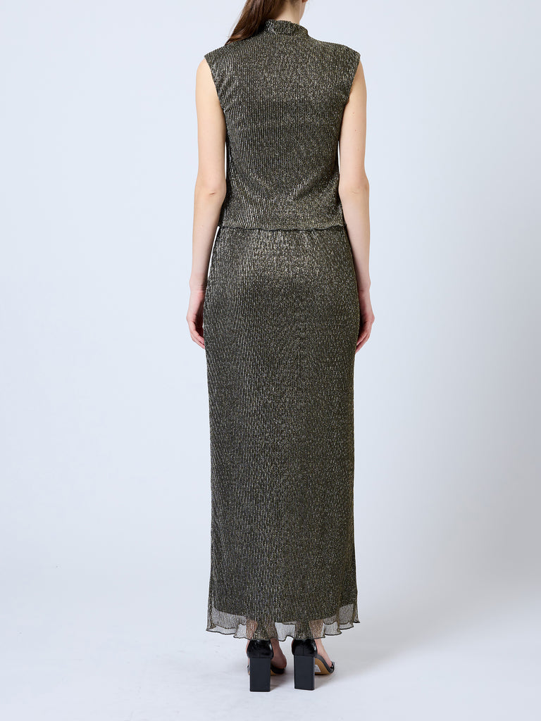 All that shimmers is the Tamy Lurex Plisse Sleeveless Top. This sleeveless top features a high neckline and lettuce hem whilst presenting metallic lurex stripes in a plisse texture.