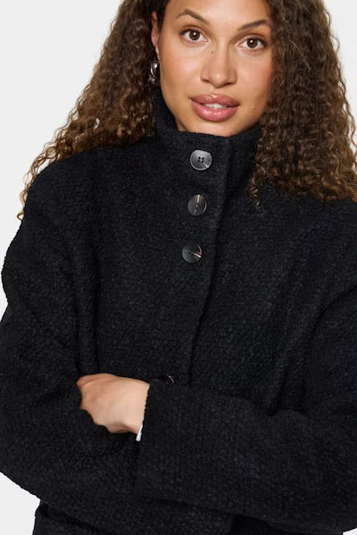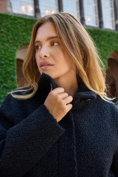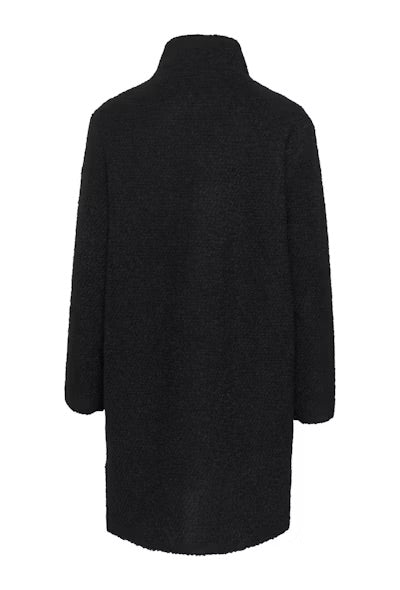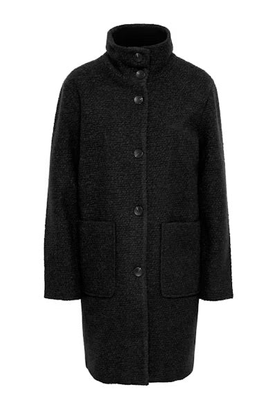 This cozy, black-colored coat features a chic, high neckline and a soft, textured finish. Its minimalist design and oversized pockets add a touch of effortless elegance to your cold-weather wardrobe. The model is 176 cm tall and wears a size M.