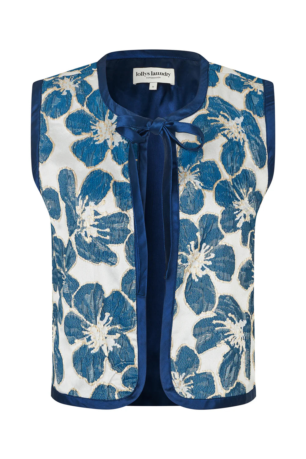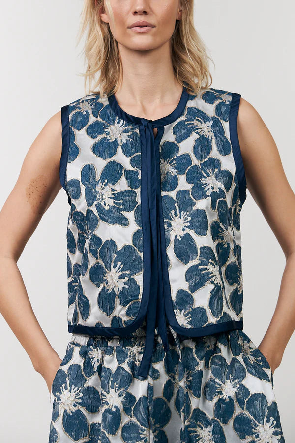 LivLL vest is a feminine and decorative vest in a beautiful woven floral design. The open front and tie detail at the neckline create a charming and elegant look, while the contrast bindings frame the silhouette and highlight the delicate pattern.