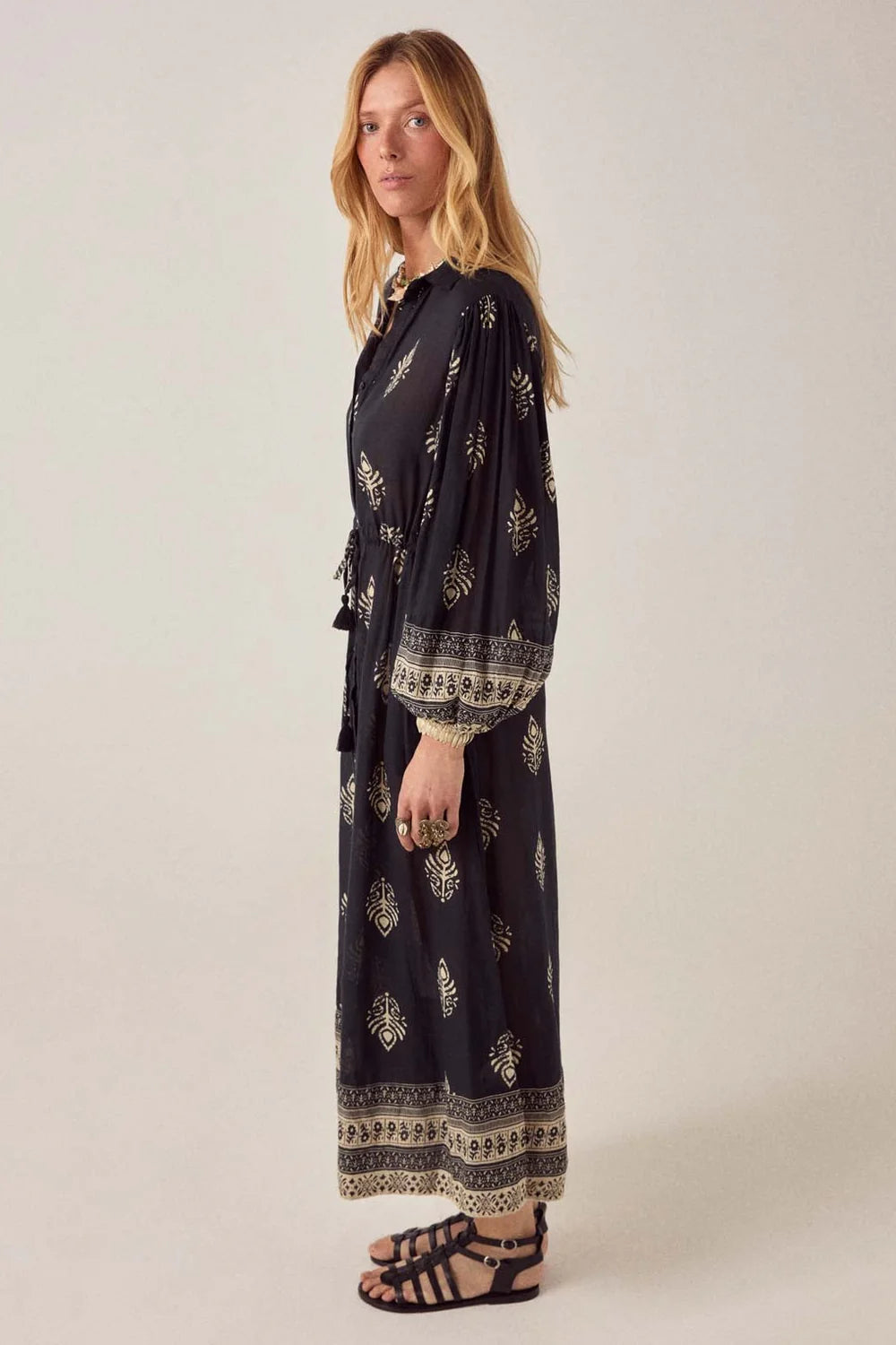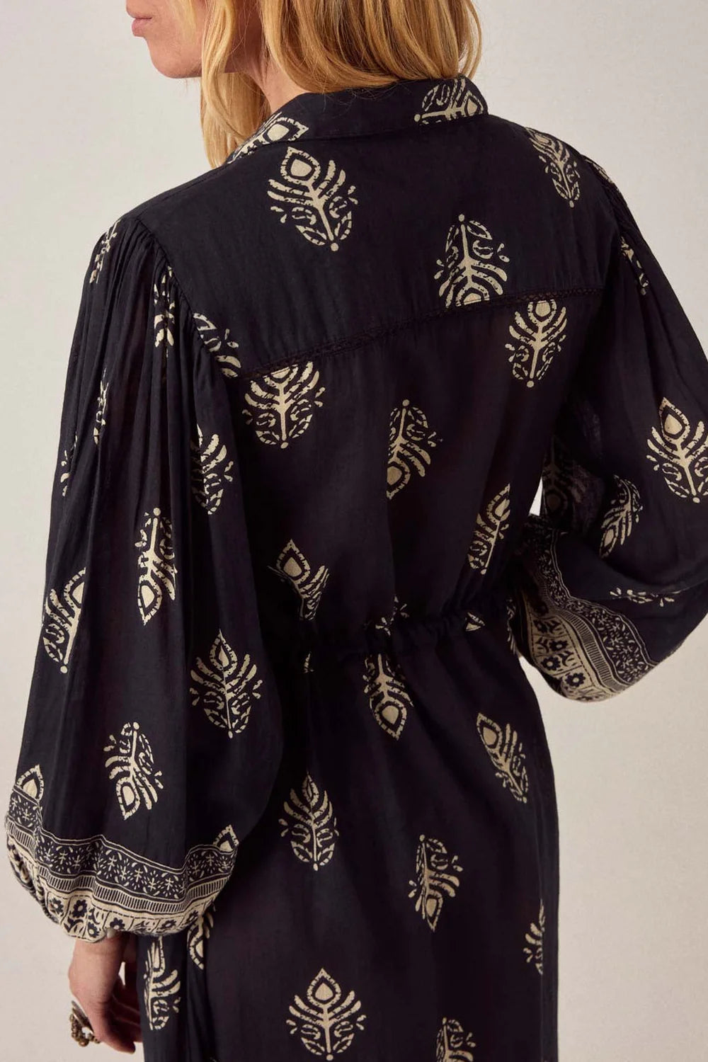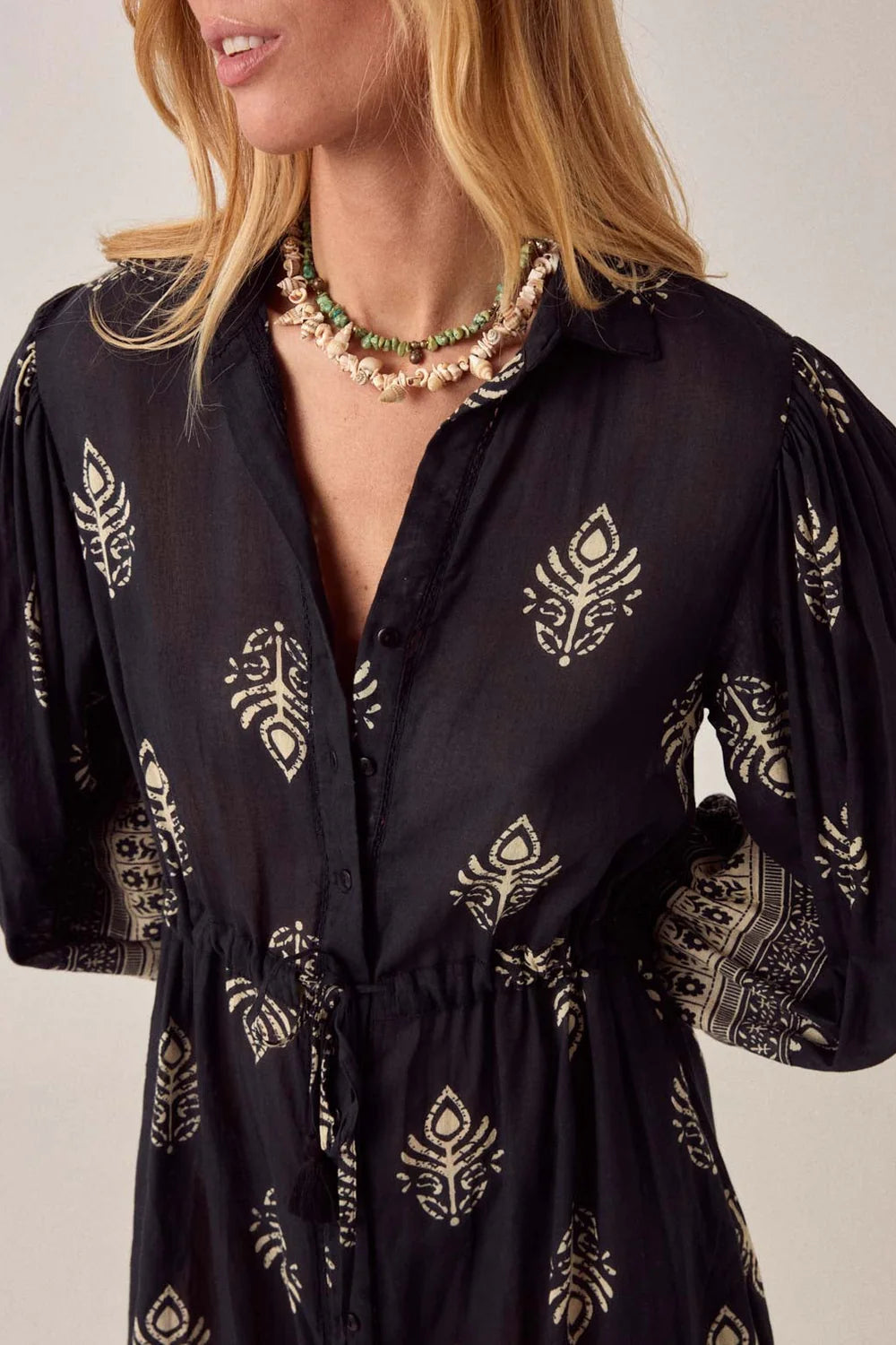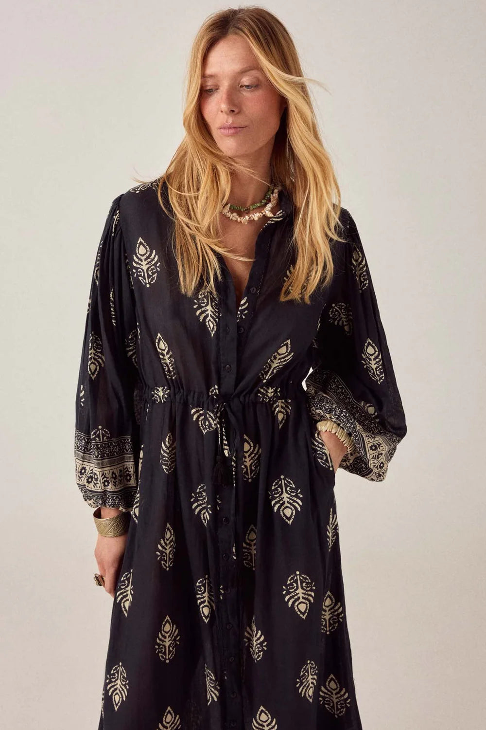 Shirt dress in lightweight cotton gauze. Collared, button-down front running full length, long sleeves with button cuffs. Drawstring at the waist to cinch or leave loose. Soft, fluid fall that moves easily around the body.