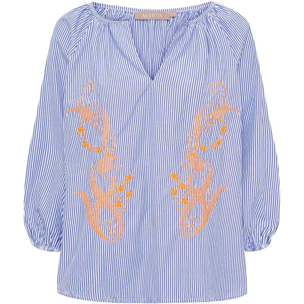 Brooke Blouse from Marta du Château is a beautiful and feminine blouse with fine details. The blouse is designed in a light material with classic blue and white stripes, which gives a fresh and summery look. It has a relaxed fit with 3/4 sleeves and elastic at the sleeve end that creates a soft and comfortable silhouette. The open V-neckline adds an elegant touch, while the decorative embroidery in a warm orange shade at the front gives the blouse a unique and eye-catching look. A perfect blouse for both everyday and holiday – style it with jeans, shorts or light trousers for a casual yet stylish outfit.
