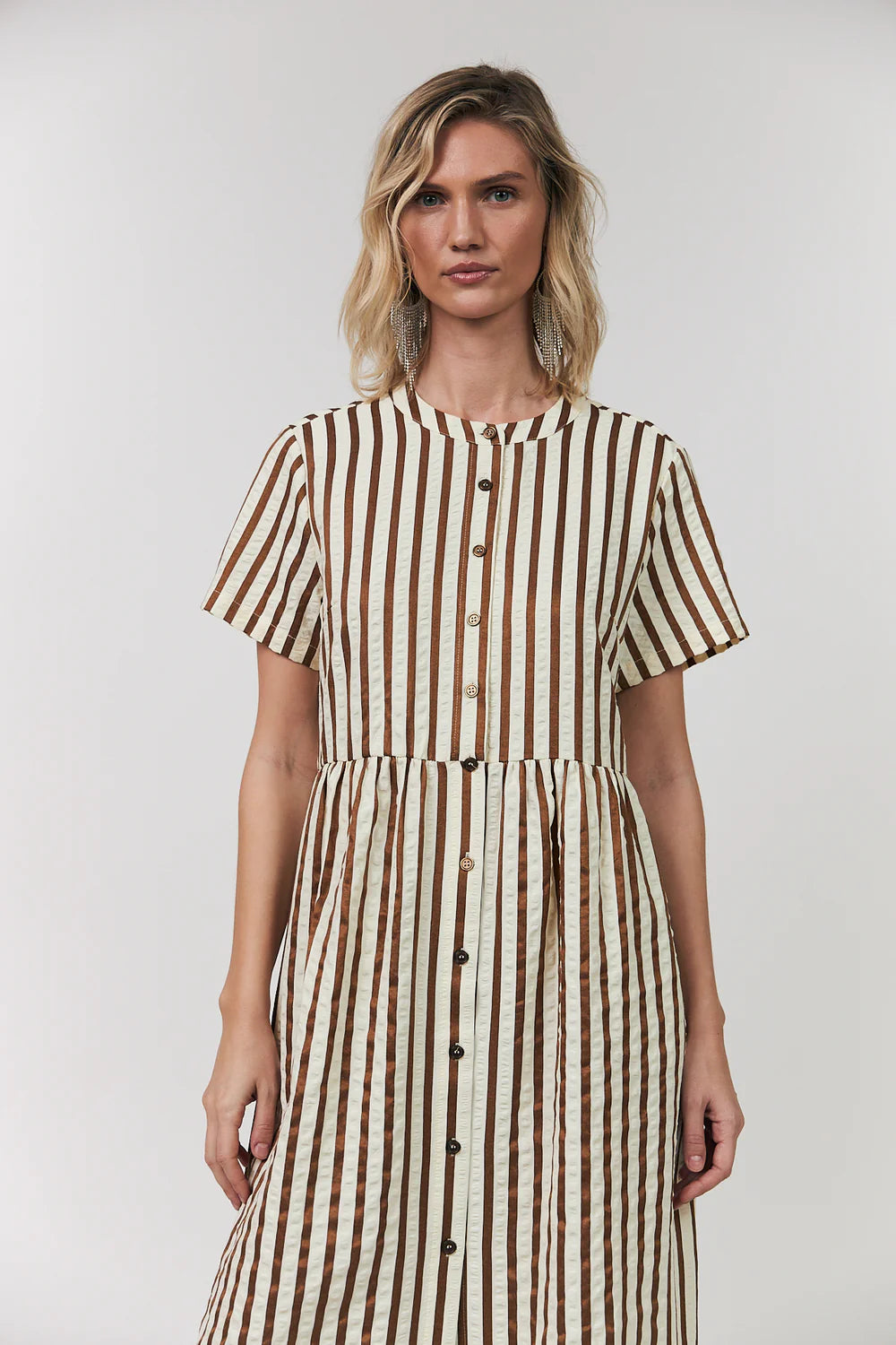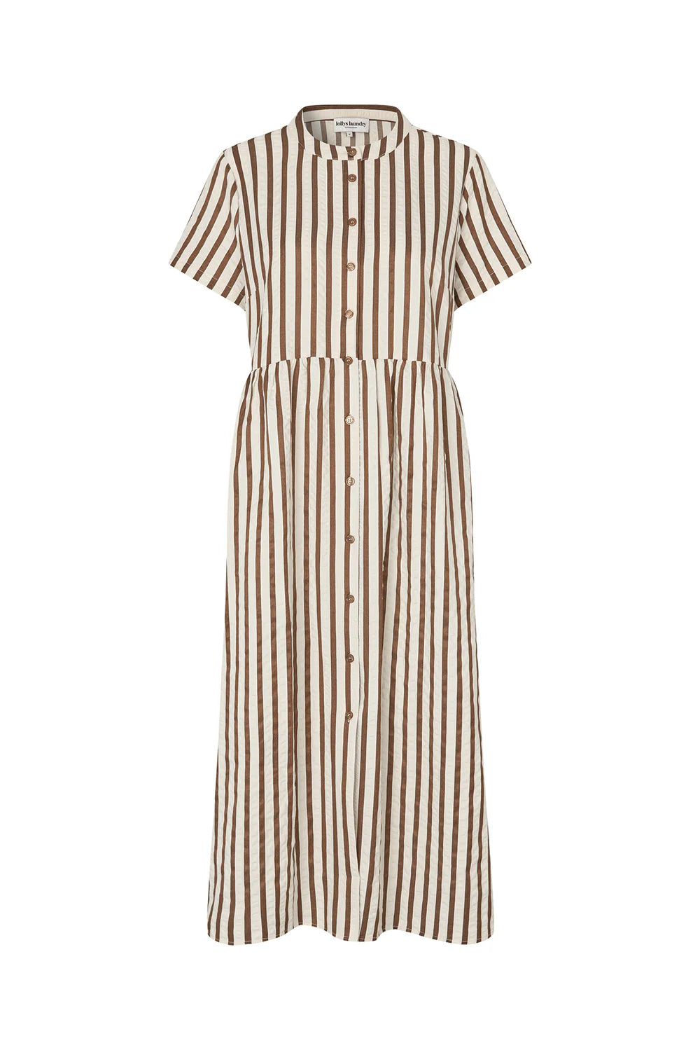 AliyaLL is a light dress in beautiful vertical stripes. The clean silhouette is combined with a button closure at the front and a lightly gathered high waist that creates a lovely drape and a comfortable fit. The short sleeves and soft quality make the dress easy to wear all day.