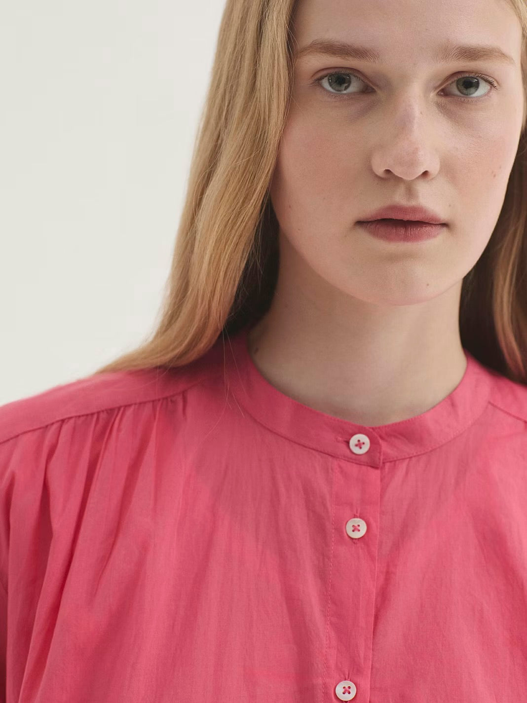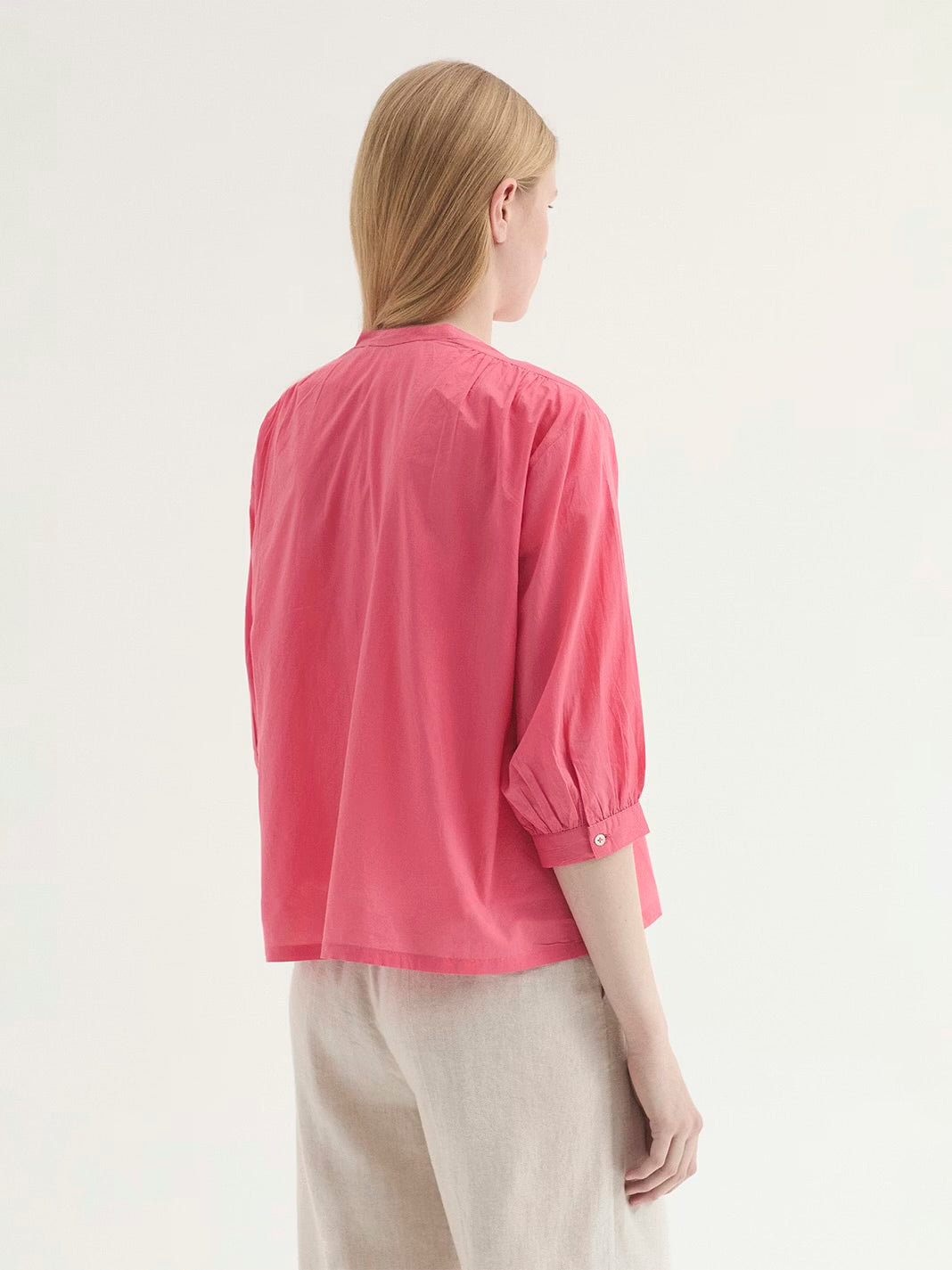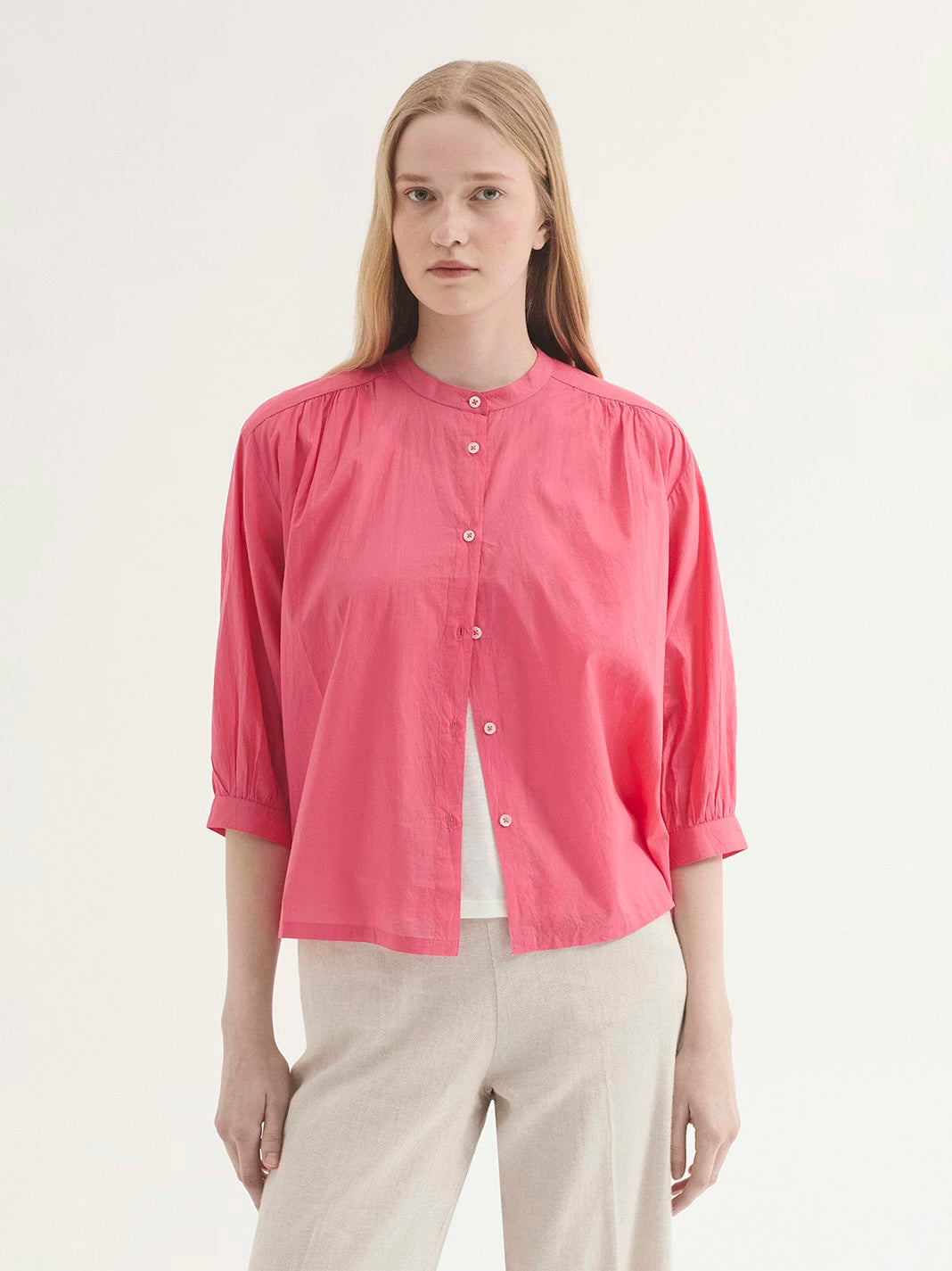 Light cotton shirt round mandarin neckline, button closure, 3/4 sleeve, relaxed fit.