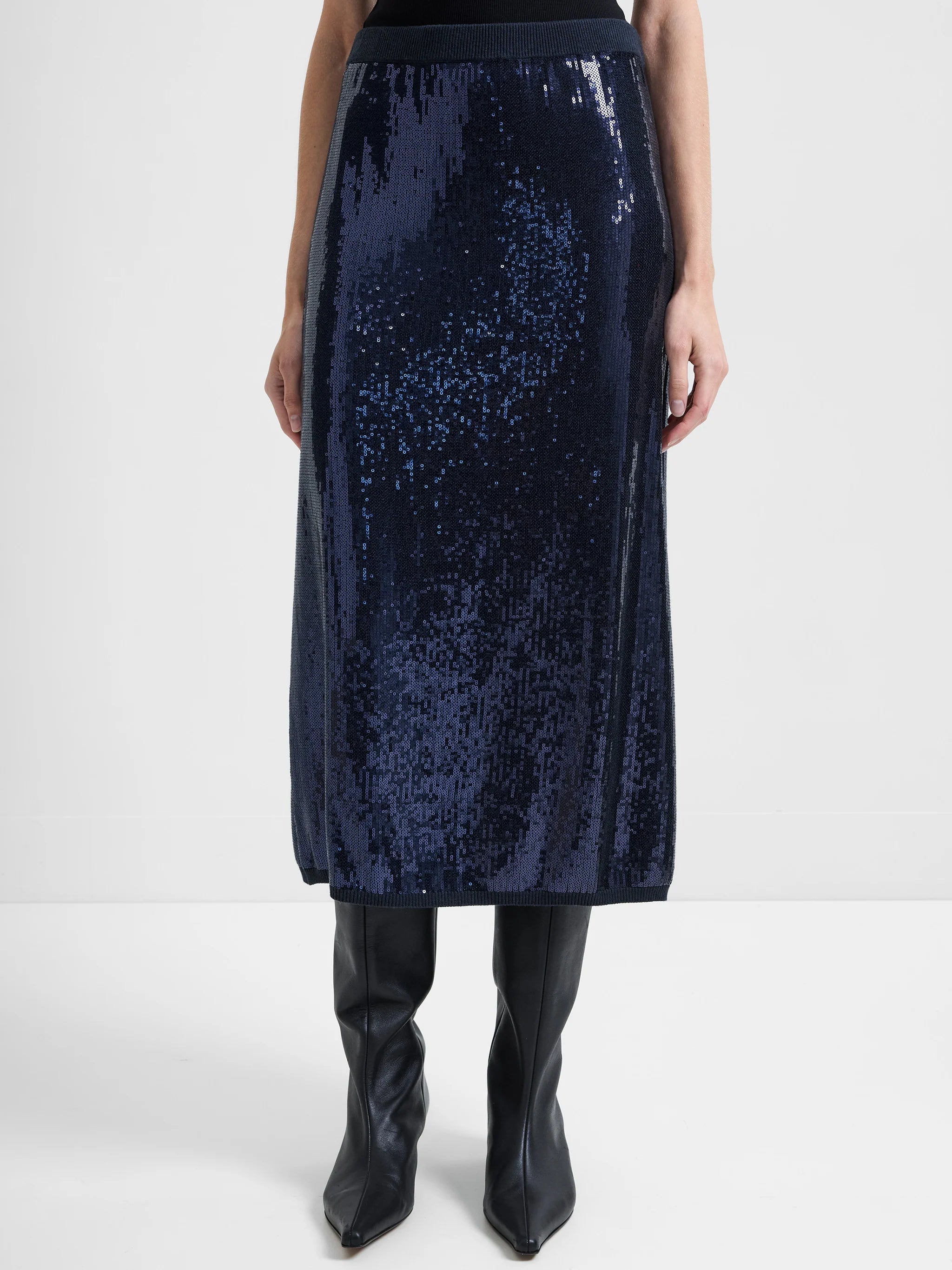 Shimmer from every angle. Our Hannah Knit Sequin Midi Skirt is cut to a sleek midi length, with a back split and all over sequin embellishment, for a modern take on glamour.