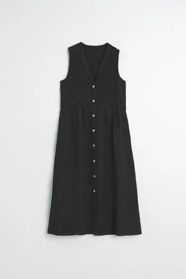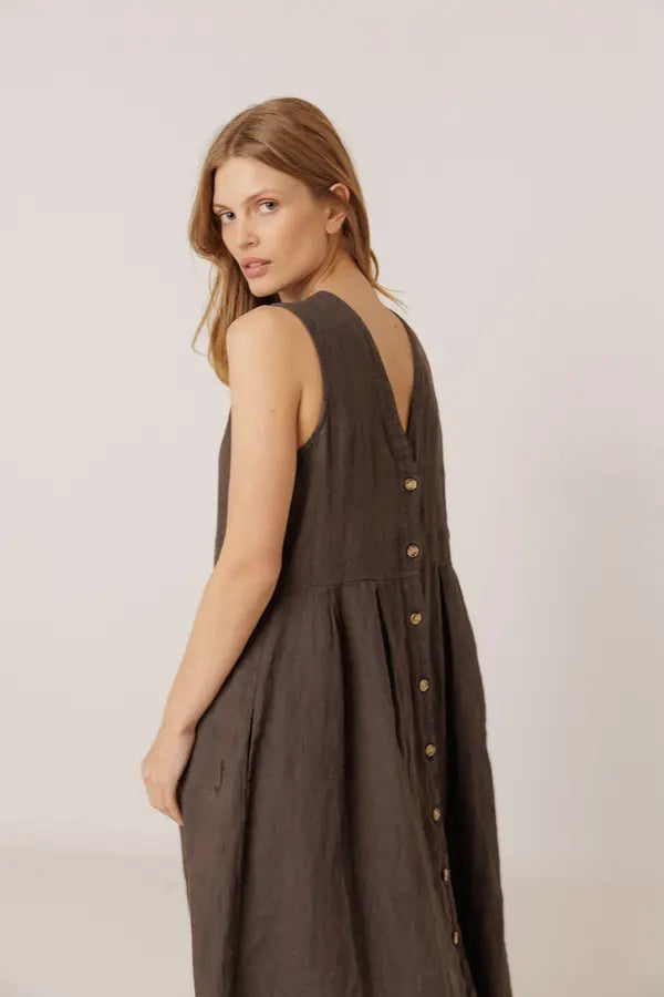 Linen sleeveless dress with v neckline, midi length, buttons all the way down, side pockets, regular fit.
