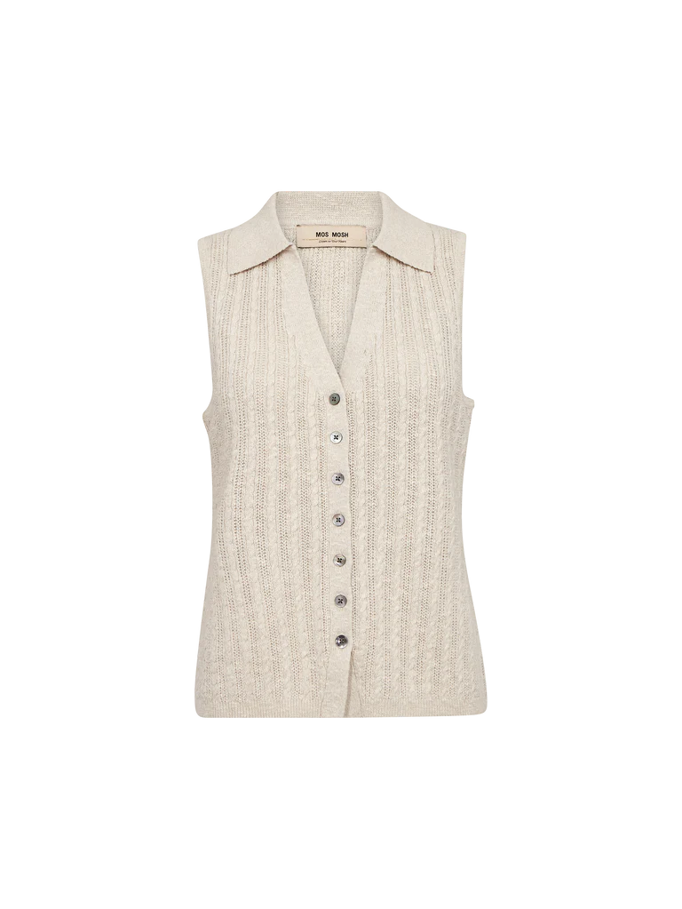 A sleeveless knit top featuring a classic collar and full button-down front. Made from a soft cotton, linen, and silk blend, it offers a refined texture with a lightweight feel - perfect for layering or wearing on its own for a polished, effortless look.