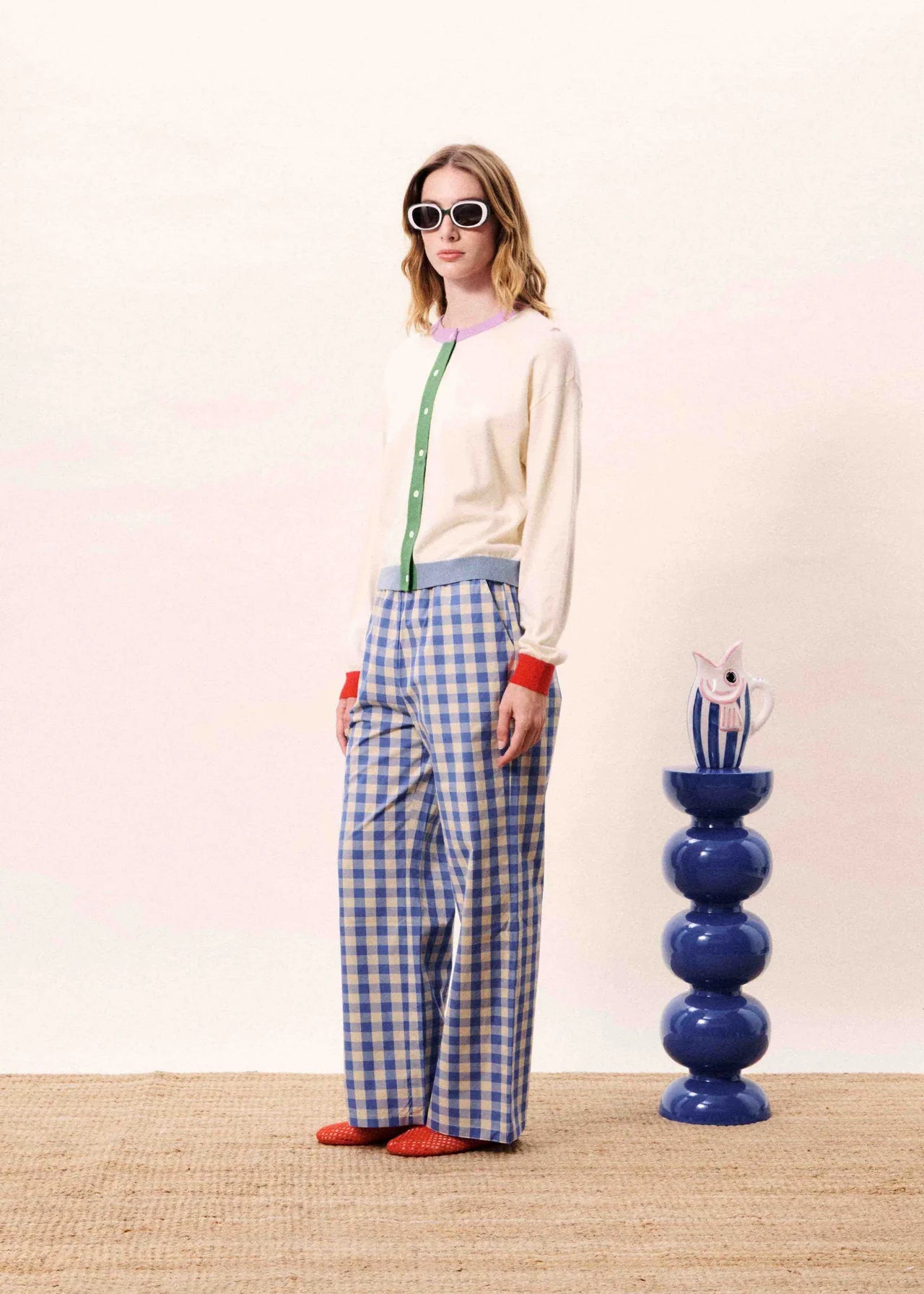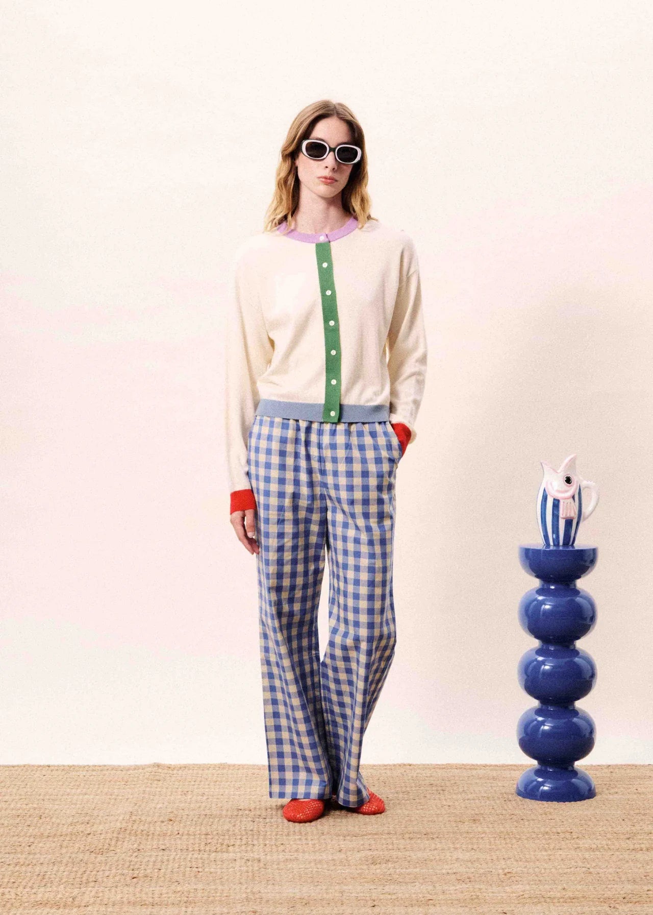 Knit cardigan with colorblock details and a central button closure. • Long-sleeved cardigan with a round neck • Front button closure on a contrasting green band • Colorblock details: purple collar, red cuffs, blue-gray hem • ​​Natural beige knit base • Straight, fitted cut Size: If you are between sizes, choose the smaller size.