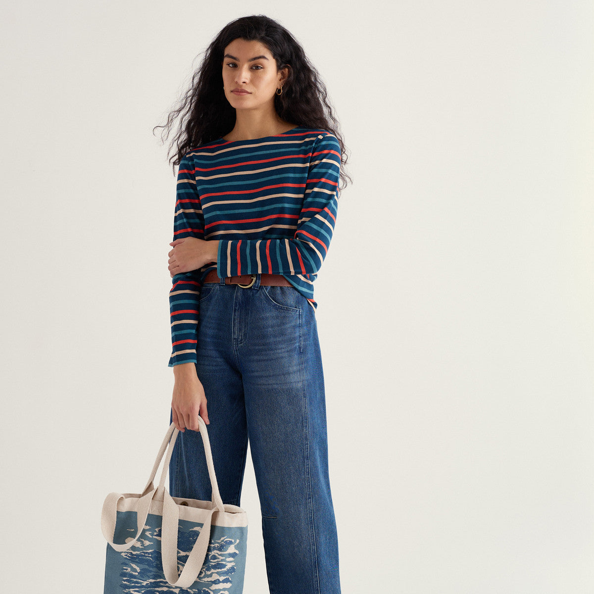 A long sleeve version of our classic sailor stripes, made with soft and breathable organic cotton, with an elegant boat neck and relaxed fit. The stripes come in a range of coastal colours, and are yarn-dyed for crisp vibrancy. Choose from a range of designs including slim Bretons and Falmouth stripes. Effortless style perfect for layering. GOTS represents the gold standard of organic cotton, which is grown without harmful fertilisers and pesticides, protecting wildlife, soil quality and people.