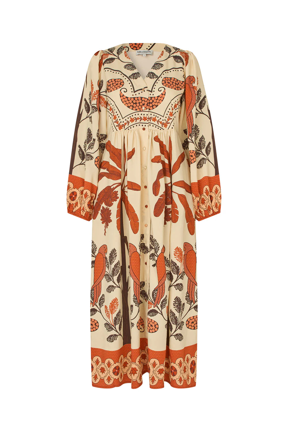 SaraiLL is a dreamy and artistic dress in warm tones and a beautifully detailed print. It carries a bohemian feel with a unique charm. The silhouette is loose and feminine with front button closure and a soft drape that makes it comfortable for both everyday wear and festive occasions.