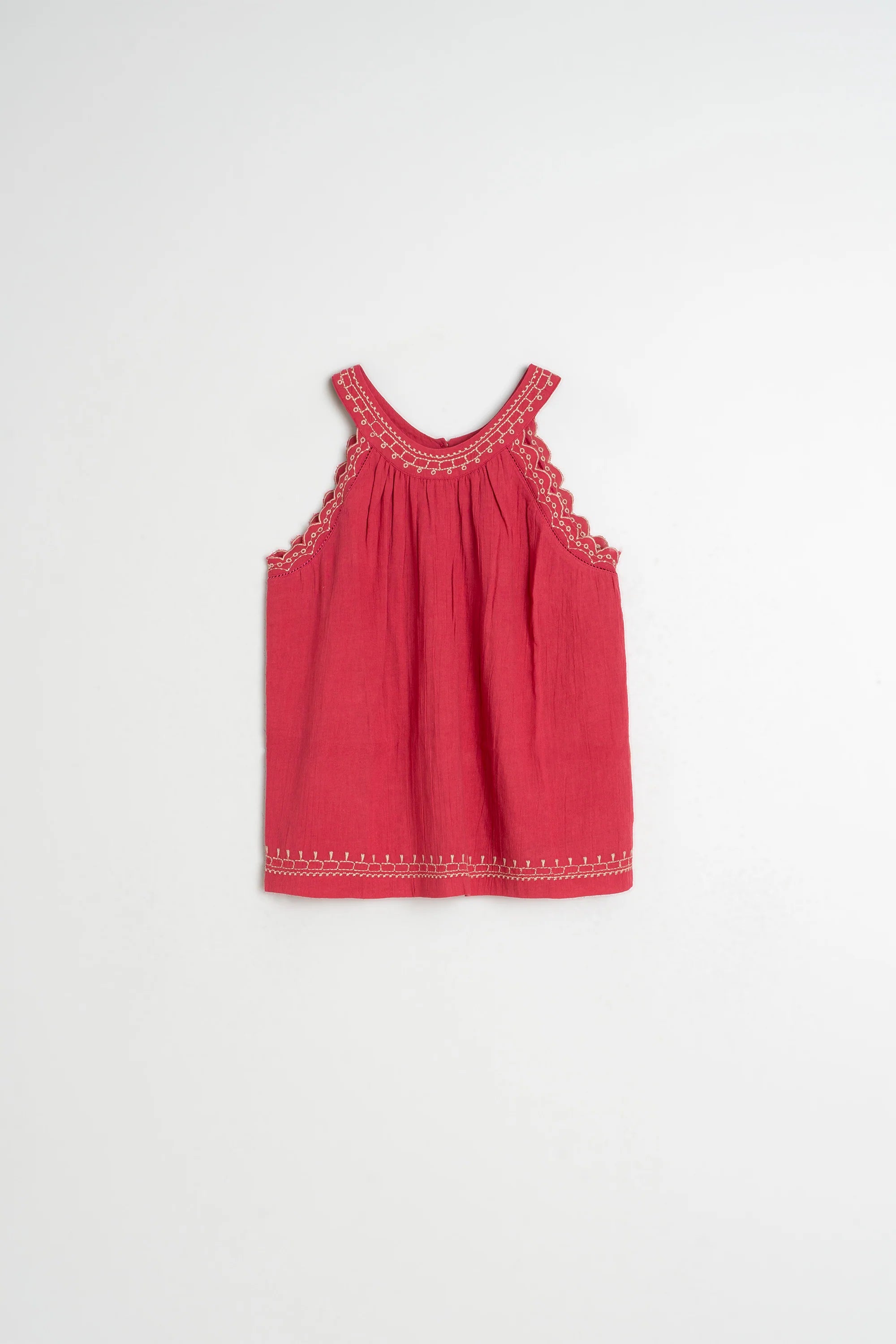 Round neck with buttons at the back, relaxed swing fit, scalloped edge under arms, beautiful contrast stitching details.