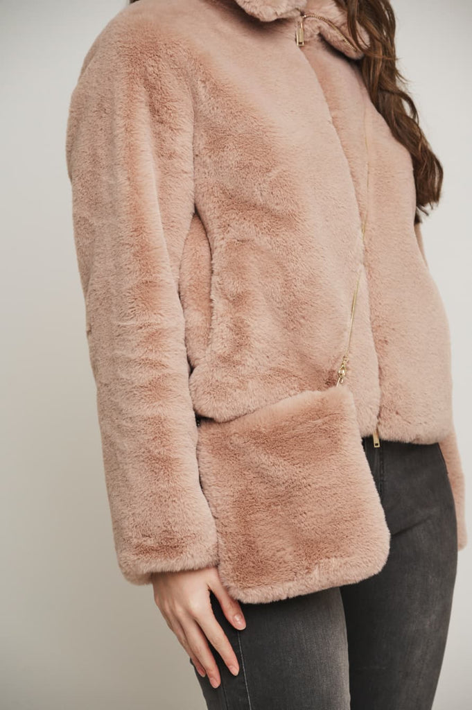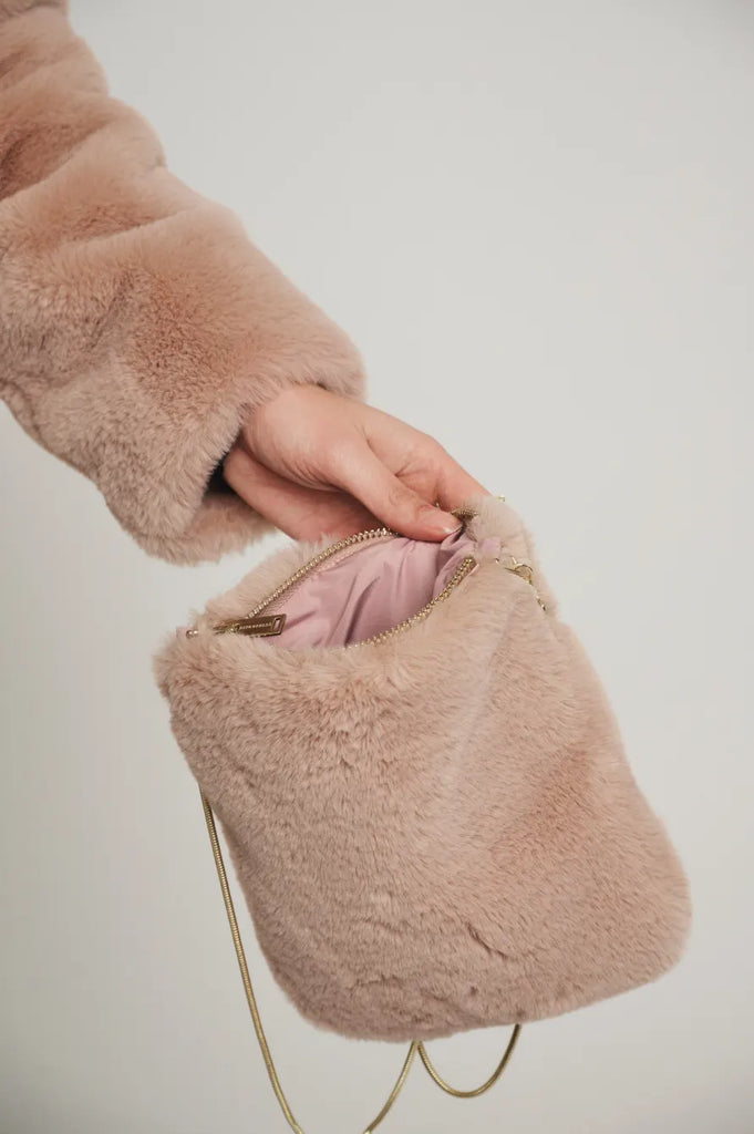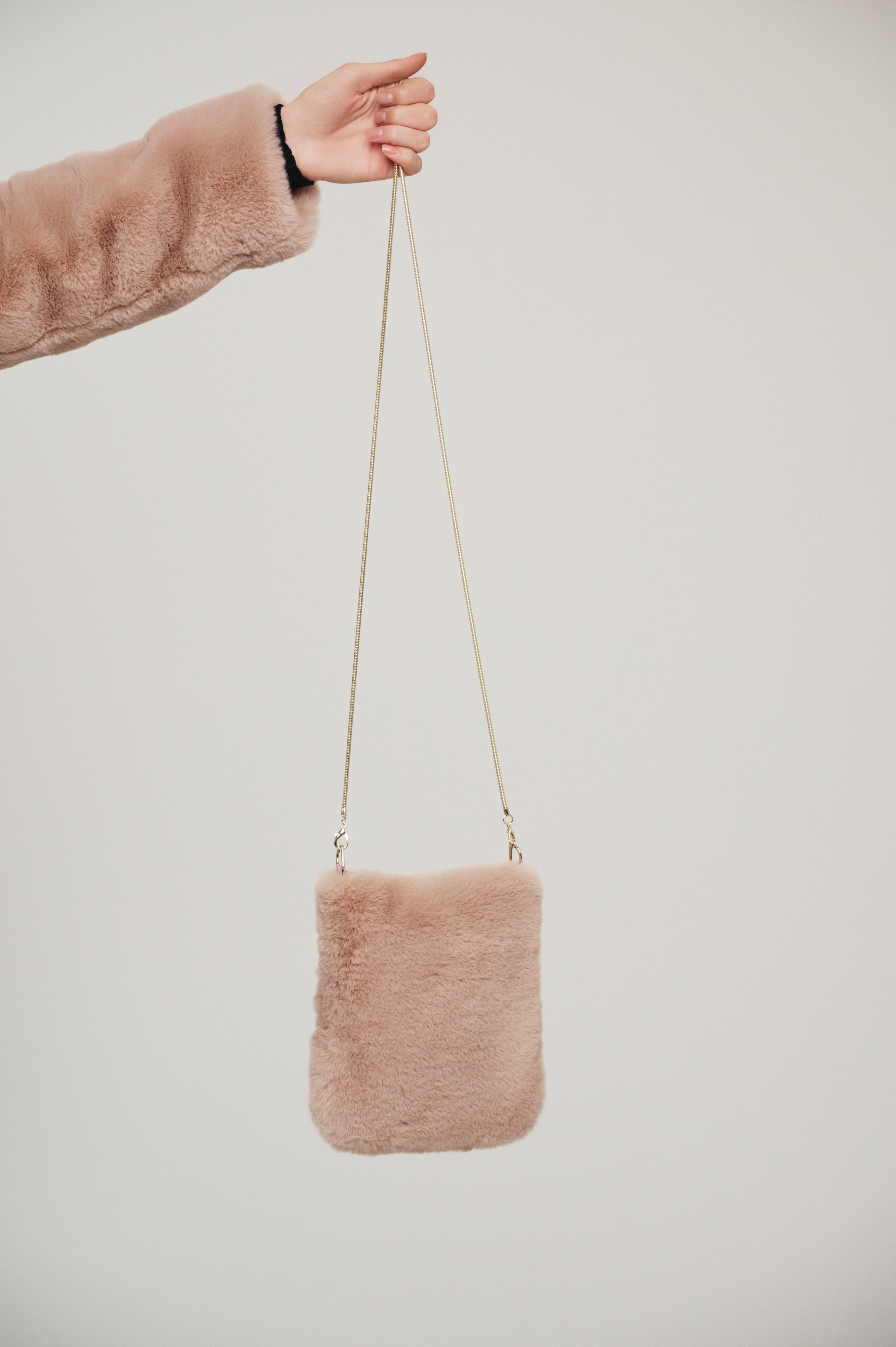 Small shoulder bag with a long metal handle. Detach the thin metal cord with its clasps. This eyecatcher features a zipper closure with a contrasting piping and a faux-fur top fabric.