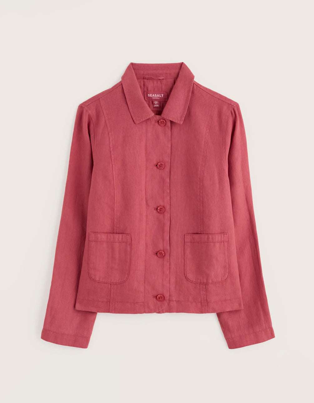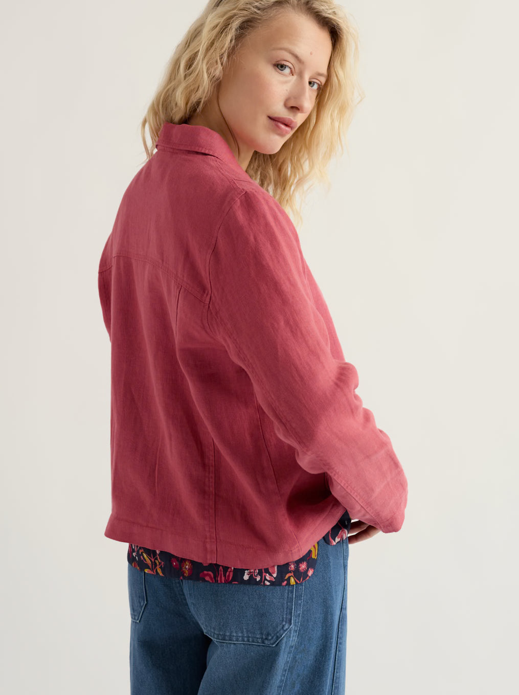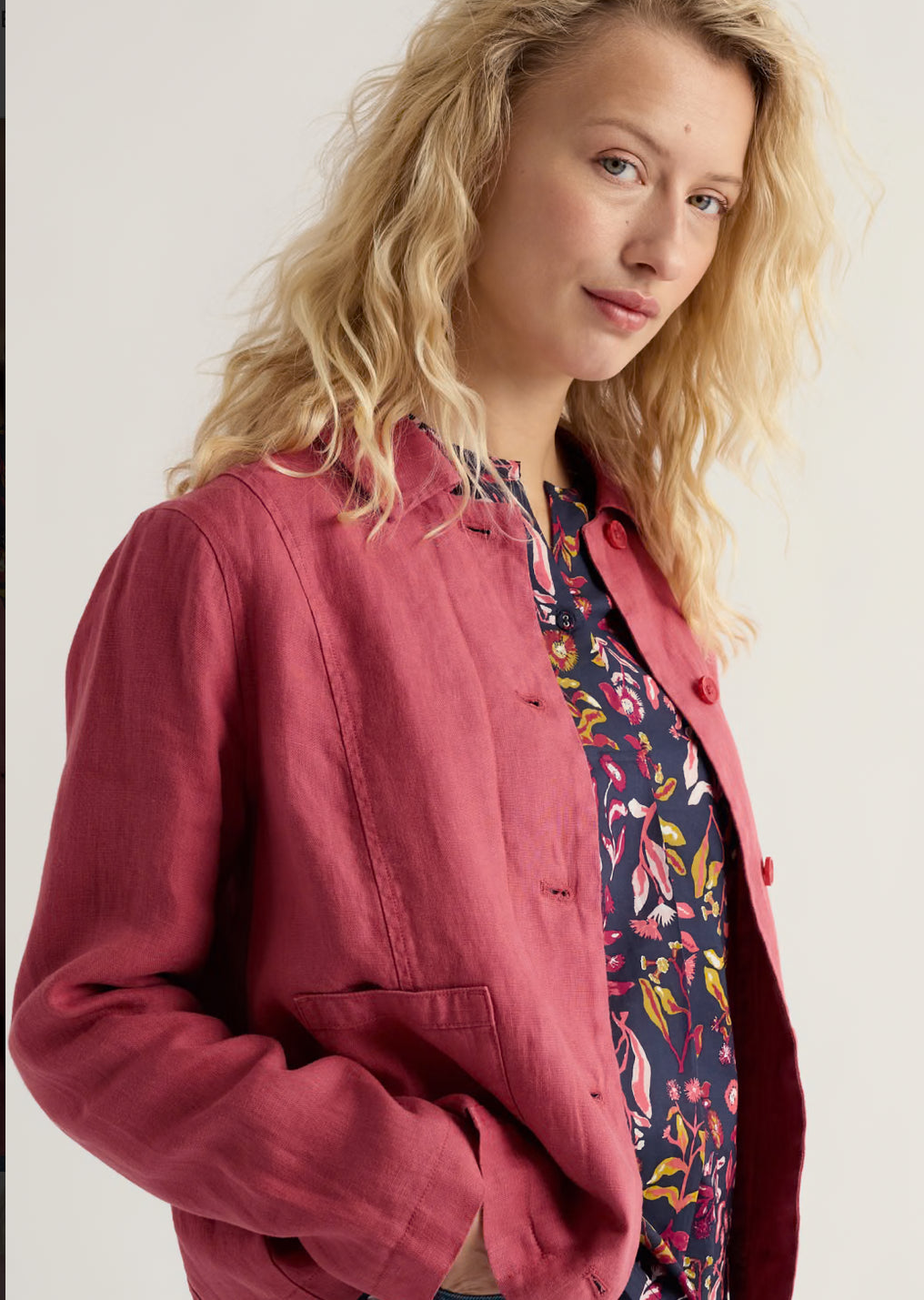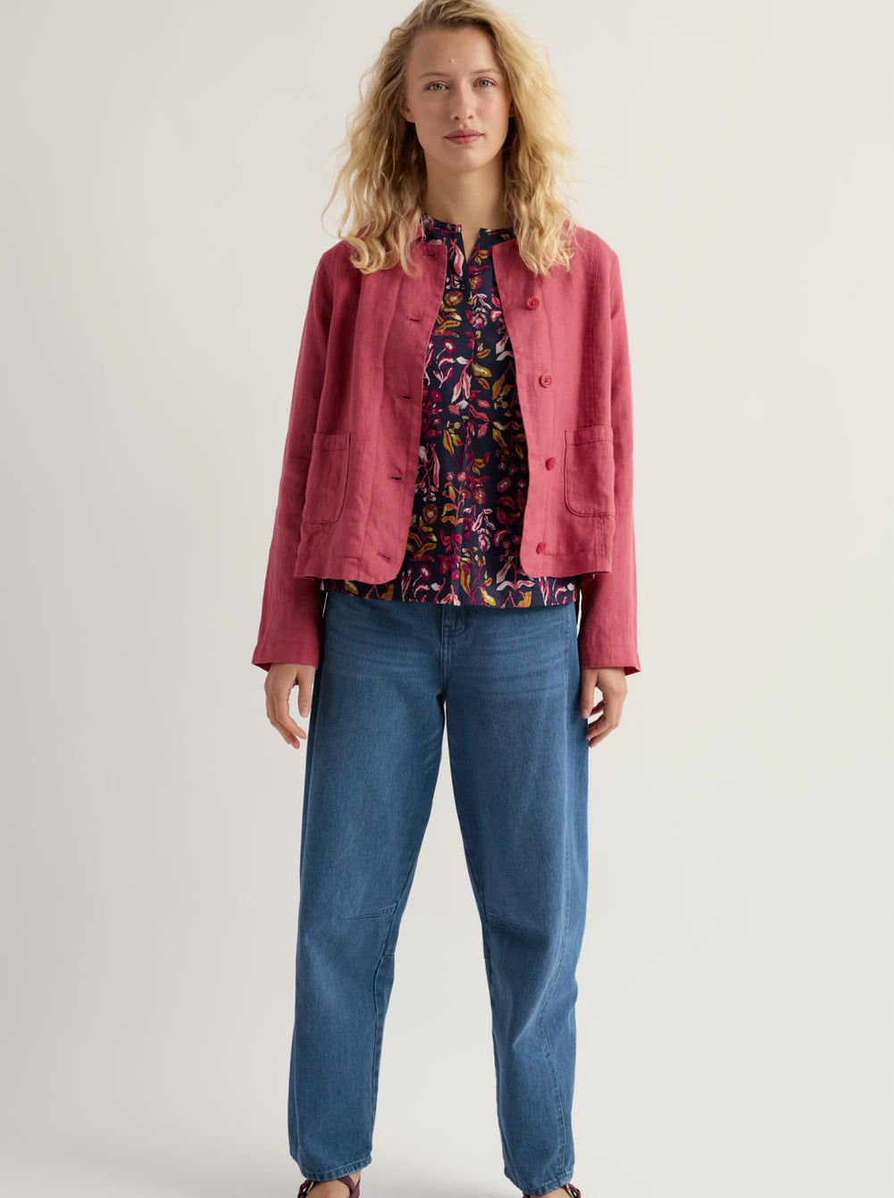 A classic garment-dyed linen jacket with an easy, relaxed structure that's influenced by Cornish workwear. Throw over jumpers and jeans, or wear loose over flowing dresses. Our linen will grow softer and smoother with each summer of wear, developing a characterful pattern of highs and lows that is completely unique.