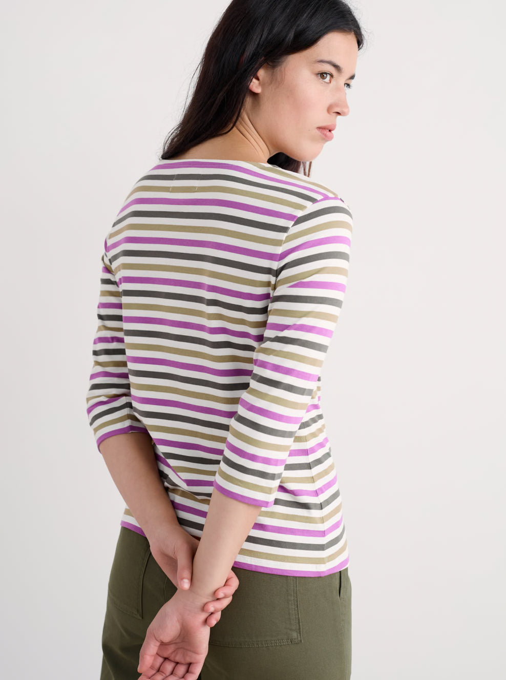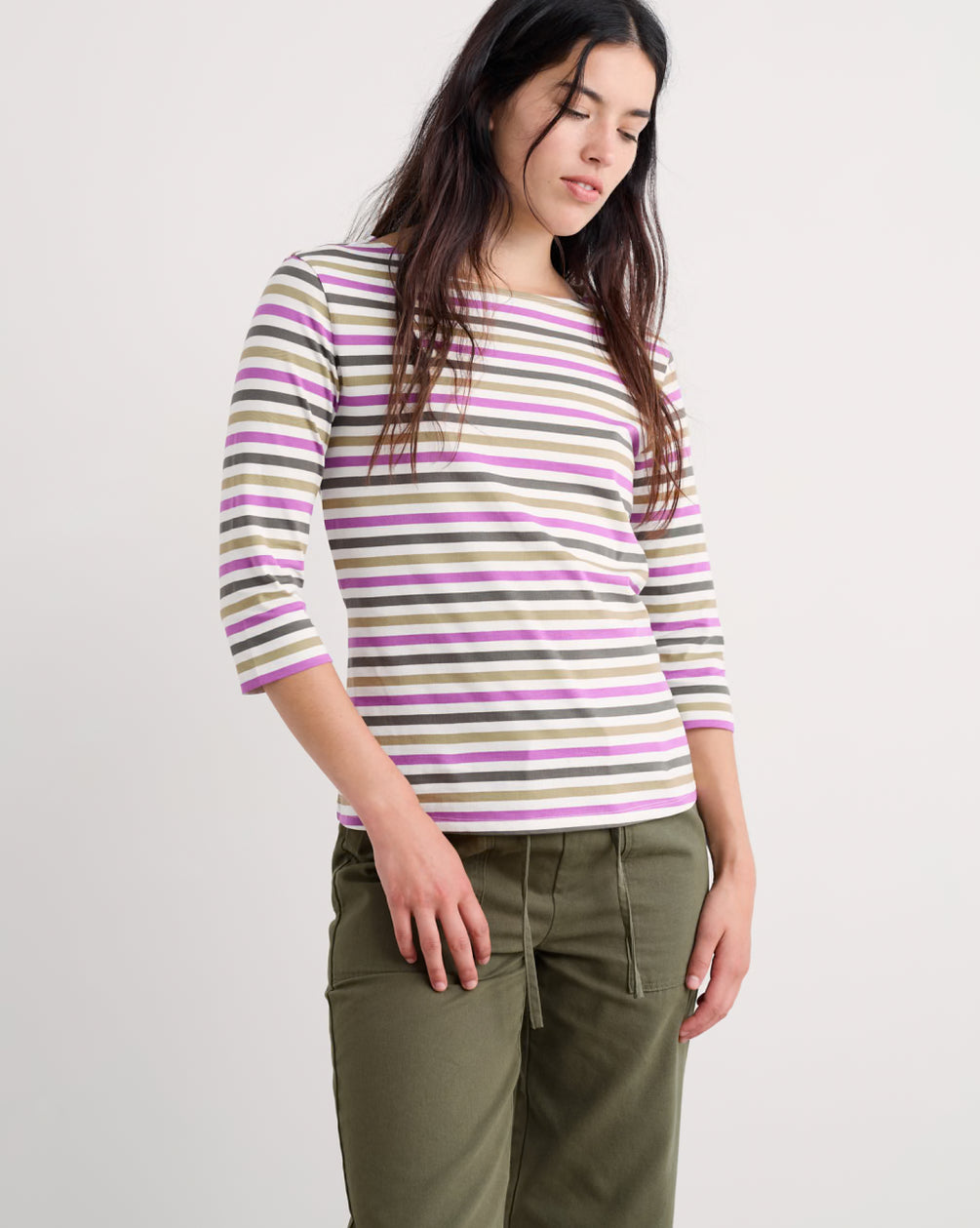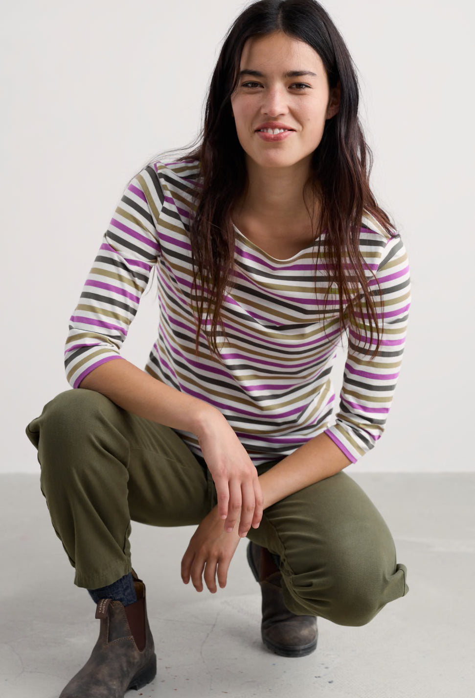 3/4 sleeve version of our classic sailor stripes, made with soft and breathable organic cotton, with an elegant boat neck and relaxed fit. The stripes come in a range of coastal colours, and are yarn-dyed for crisp vibrancy. Choose from a range of designs including slim Bretons and Falmouth stripes with a plain yoke. Effortless style perfect for layering. GOTS represents the gold standard of organic cotton, which is grown without harmful fertilisers and pesticides, protecting wildlife, soil quality and people.