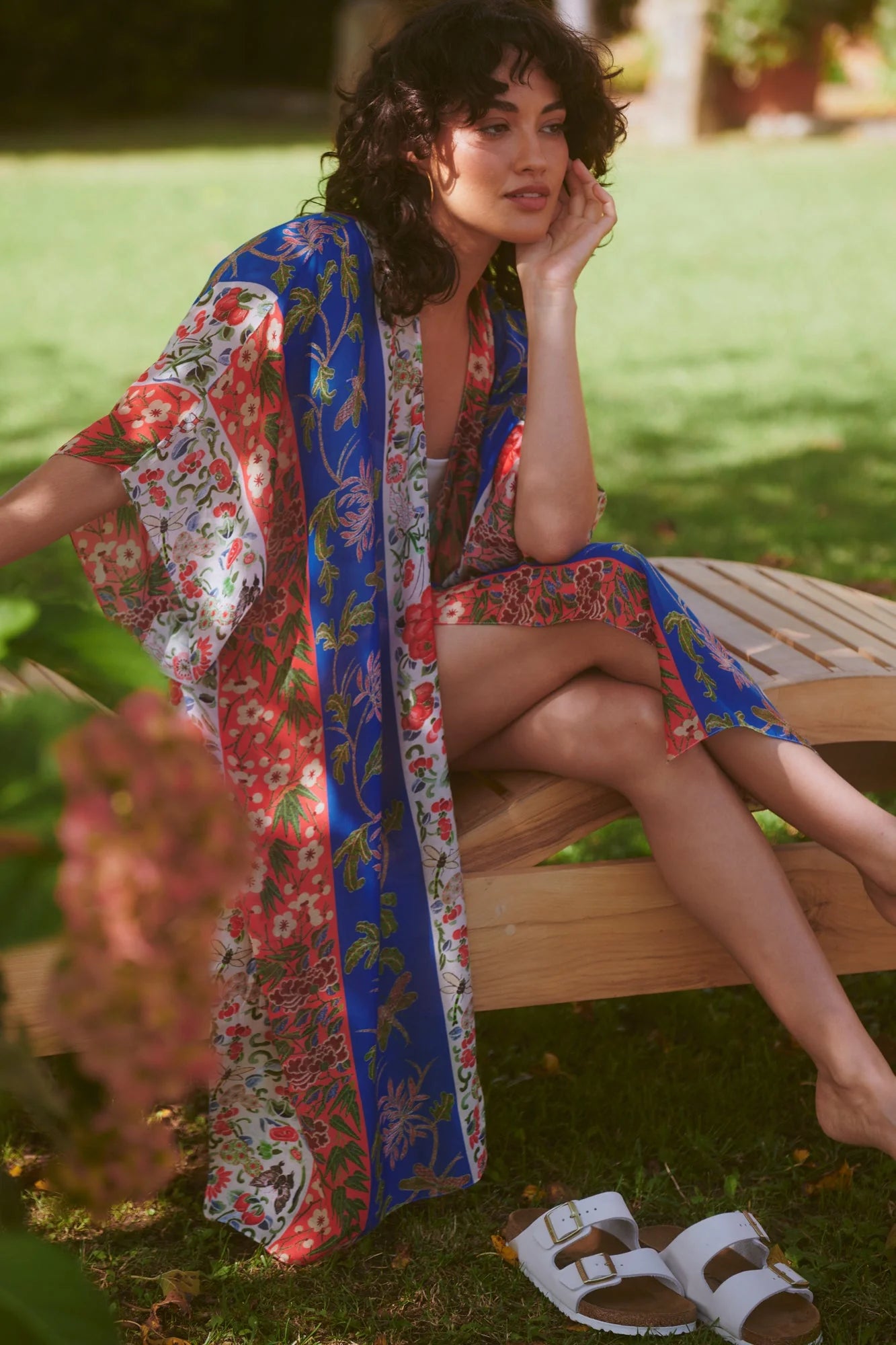 Stripes of rich oriental embroidered print, with climbing honeysuckle, dragonflies and roses layer this pattern on the impactful cobalt, ecru and scarlet ribbons.