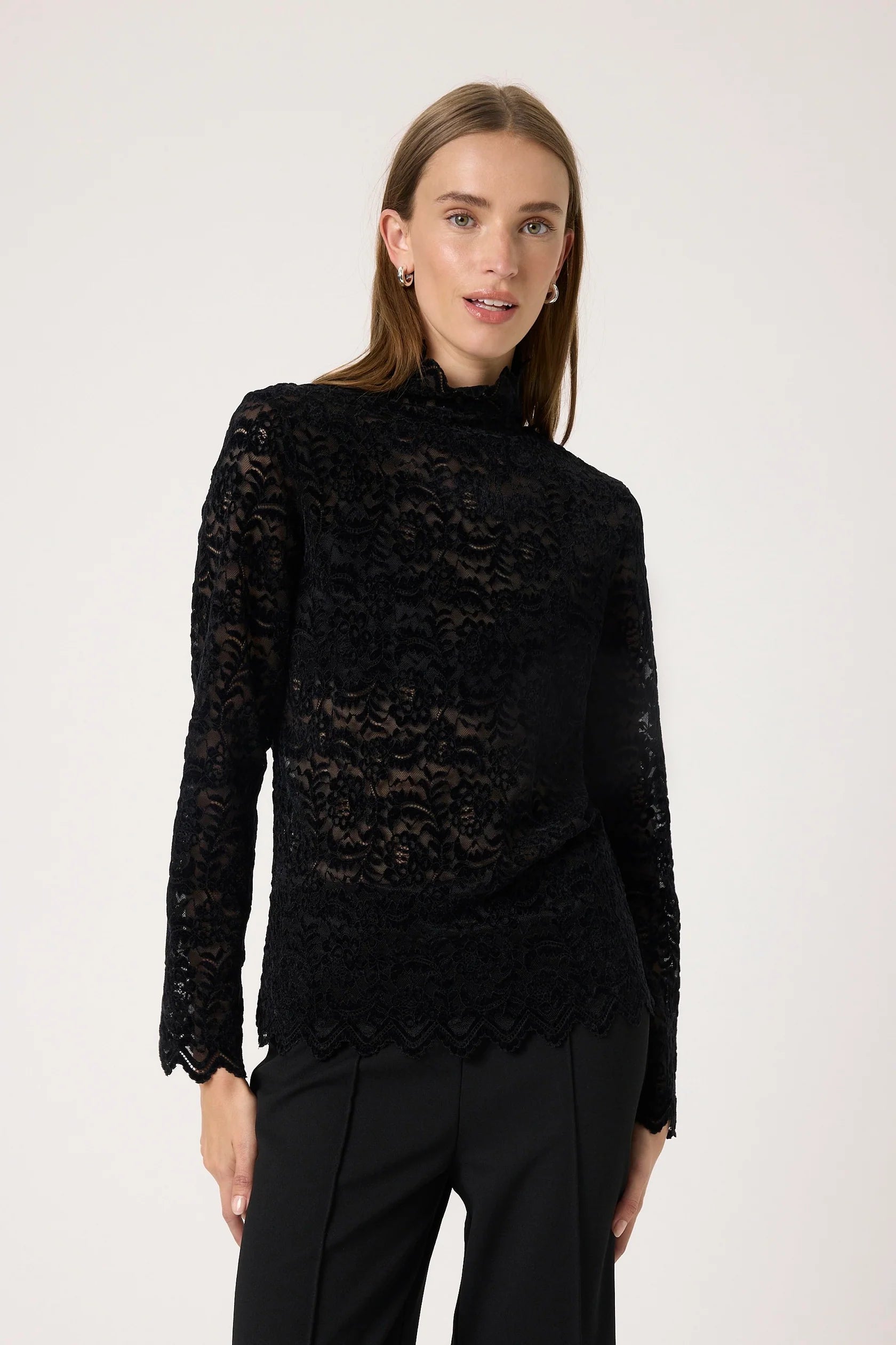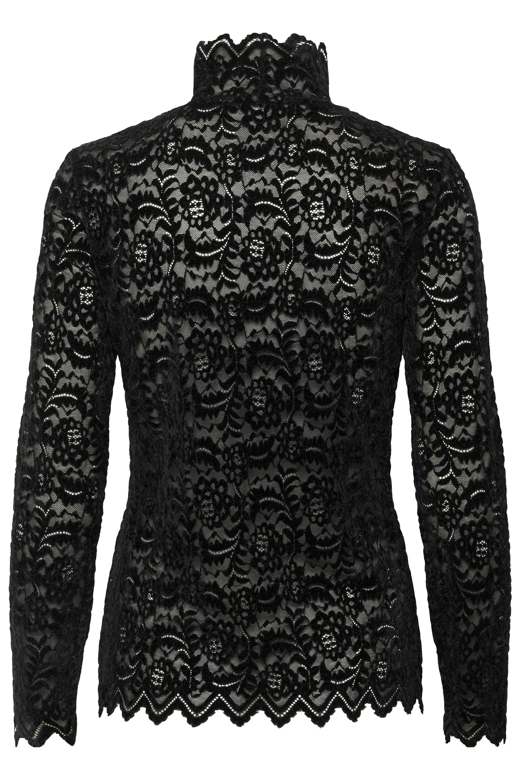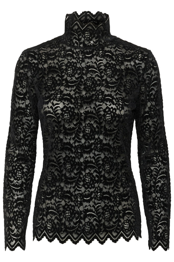 High neck, long sleeve lace top.