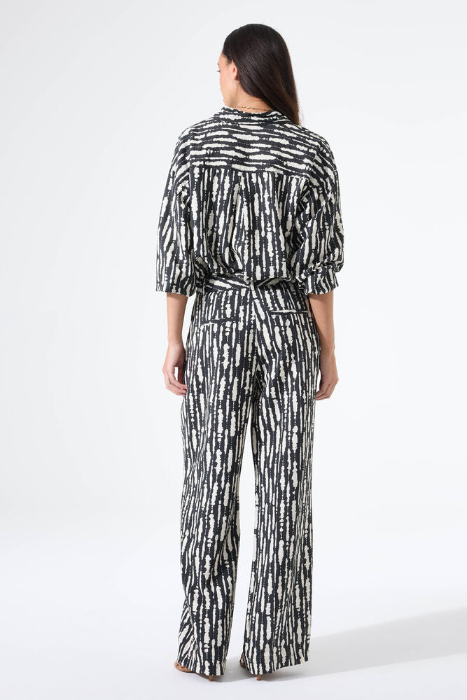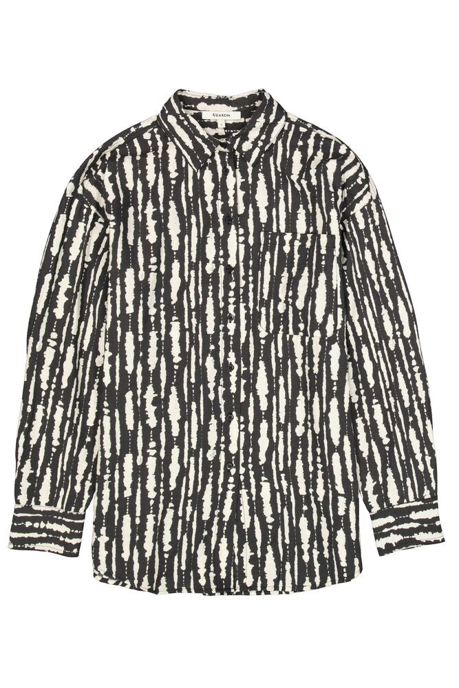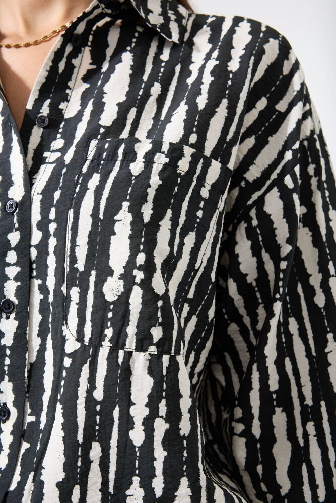 Crinkle blouse with allover print. This blouse features long sleeves, a button closure, a collar, and a regular fit. This item is made of 80% viscose and 20% polyamide.