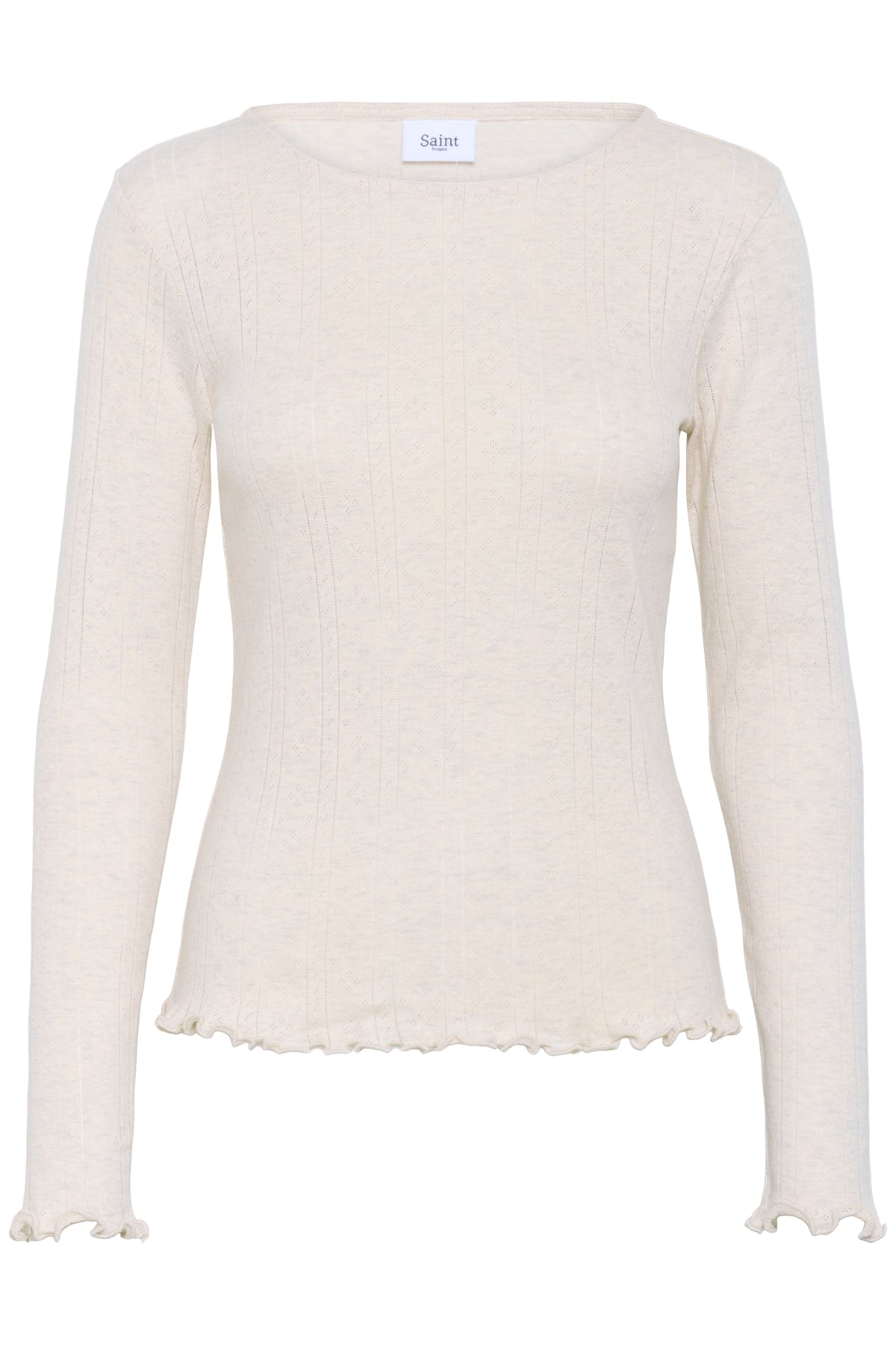 This long sleeve fine knit top features a slim fit, round neckline, and softly flared sleeves. The delicate ruffled hem and cuffs add subtle feminine style, making it perfect for casual and versatile looks.