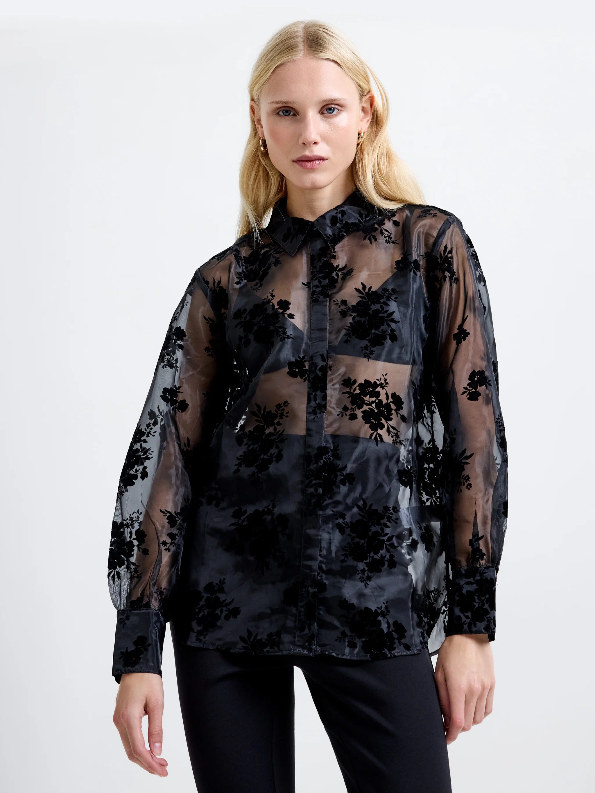 Sheer drama, brought to you by our Mika Flocked Organza Floral Long Sleeve Shirt. This black organza shirt is adorned with soft flocked florals whilst featuring a pointed collar and voluminous sleeves, for a bold yet romantic finish.